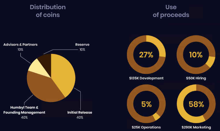 Investicije koje se privode u projekt planiraju se potrošiti na marketinšku kampanju (58%) i daljnji tehnički razvoj platforme (27%). Razvoj projekta započeo je u veljači tekuće godine. Beta verzija Humbyla će biti pokrenuta do kraja ICO-a s kasnijom pokretanjem mobilne aplikacije pomoću Dapp tehnologije.