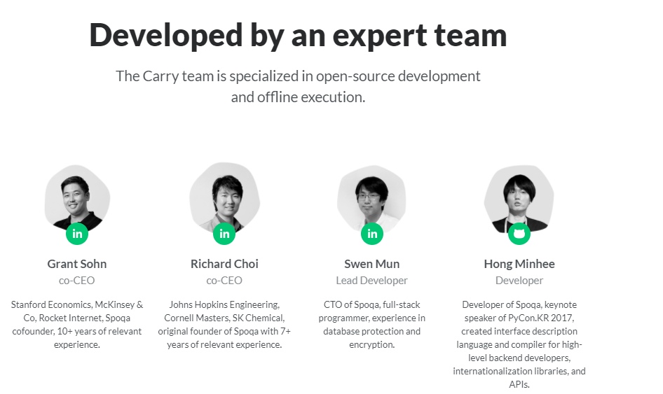 Проектом Carry Protocol занимается очень сильная корейская команда, которая ранее успешно основала Spoqa. Всего над разработкой системы работают 13 специалистов и 6 советников. Каждый из них обладает огромным опытом либо в сфере оффлайн-торговли, либо в криптовалютной и blockchain индустриях.