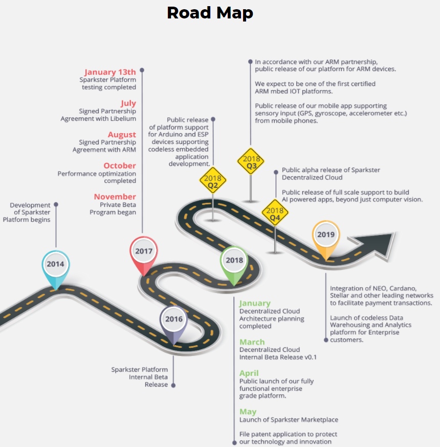 Разработка платформы началась еще в 2014 году, но идея создания подобной системы посетила ее создателей еще в 2009 г. В данное время Sparkster уже работает. В 2018 году планируется выпуск мобильного приложения с GPS, гироскопа, акселерометра и т.д. А также в этом году должен состояться публичный релиз альфа-версии.