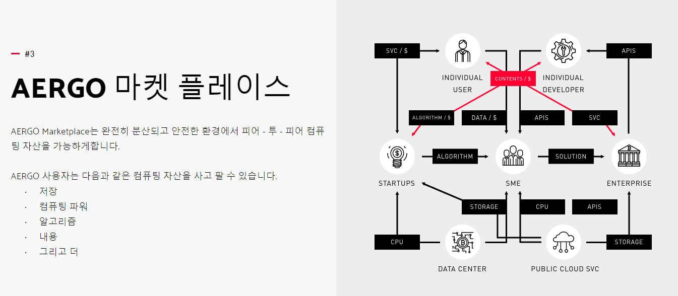 아르고 마켓플레이스(Aergo marketplace)는 소프트웨어 앱이나 컴퓨팅 리소스 등의 서비스들을 사고 팔 수 있는, 아르고 체인을 위한 가게(shop) 입니다. 역시 클라우드 마켓플레이스와 비슷하지만 진입장벽을 낮춰서 정부 기관들, 소규모 기업들, 그리고 개인 개발자들 까지도 쉽게 접근할 수 있도록 한다고 합니다. 예상되는 서비스로는 컴퓨팅 파워(CPU), 저장공간, SSD 메모리, CDN, 머신러닝 알고리즘, 디지털 인증 블루프린트 등에 대한 제공이 있을 수 있습니다.