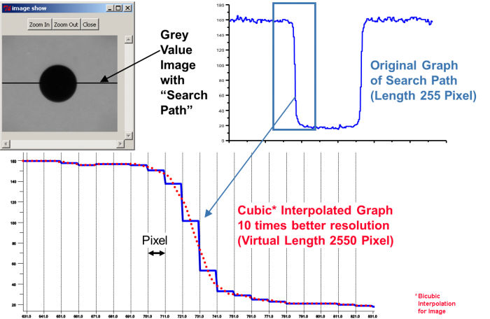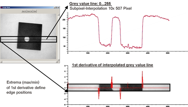 For a more precise determination of the edge position below the pixel resolution, an interpolation between the pixels is used, which is called a sub-pixel interpolation (Figure 6) [7].