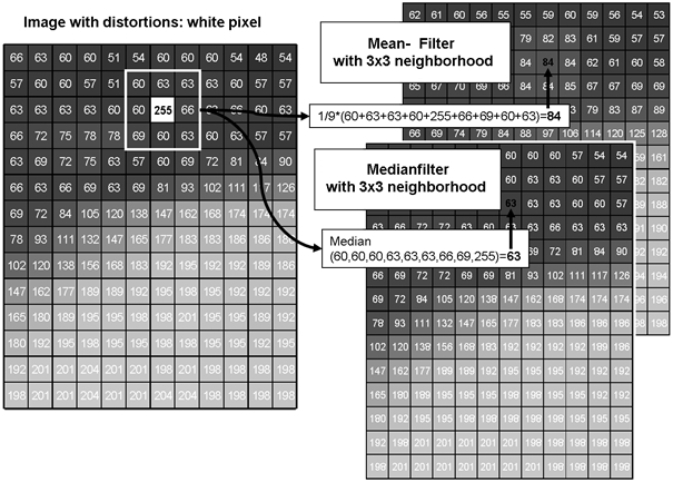 For local operators, the new gray value of a pixel depends not only on its previous value but also on the gray values of the pixels in its environment. The environment is defined by a so-called neighborhood. A typical neighborhood is the 8-neighborhood (3 x 3 pixel). Figure 3 shows the use of two operators considering the pixel itself and its eight neighbors, which are referred in this context as filters for eliminating image distortions.