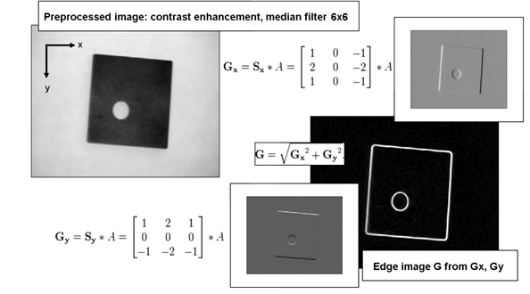 Gradient filters have high-pass properties and increase the image noise. Therefore, the filters are designed so that they result is averaged over multiple rows or columns. Another representative of this kind of edge filters is the Prewitt filter [4, 5]. For determining the edge positions also the positions of second derivative’s zero crossings can be used, such as the Laplacian filter does [4, 5]. There are moreover gradient filters for edges that combine various filters such as the Canny edge detector [6].