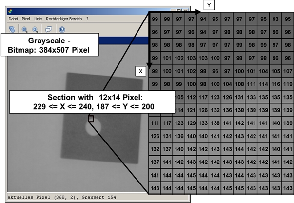 The base for many measurement applications with optical methods is intensity images. The intensity which is perceived as brightness in the image is mapped to a digital gray scale image. Therefore these images are called grayscale images. The image is a grid that is composed of individual picture elements, so-called pixels. E ach pixel represents a numerical value which represents the gray value. In a camera with a resolution of 8 bit grayscale differs from 0 for black to 255 for white, with 12-bit resolution there are 4096 gray levels. Grayscale images can be displayed as a matrix for processing and storing with software (Figure 1).