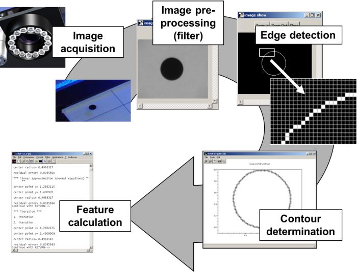 Figure 8. Simplified presentation of image processing for determination of circle’s parameters without subpixel interpolation