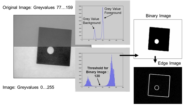 Also a binary image (Figure 2) is suitable for edge determination. Here the definition of a global threshold value, which is used for segmentation of the image into foreground and background, determines the edge position. This approach is beneficial when only one edge in an image with several edges must be identified (e. g.: shadow edges) or for low edge smoothness (“fringed” or “pixelated” edge).