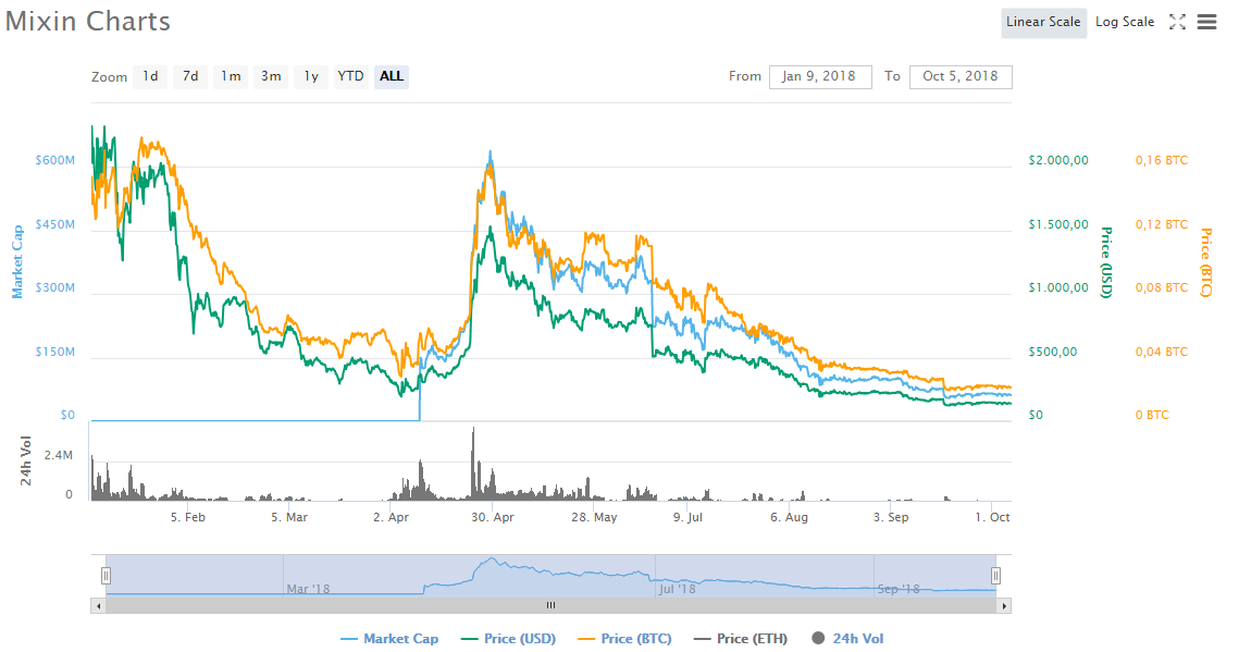 Mixin is currently trading at: FCoin, BigONE,.. With Volume 24h average of nearly $100.000