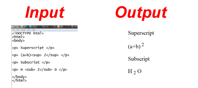 At this stage I have discussed with you two tags. Those tags are Superscript and Subscript. Through the Superscript tag, any text can be displayed above and through the Subscript tag, any text can be displayed below. In the above picture, I have shown it in input and output, you can understand it.