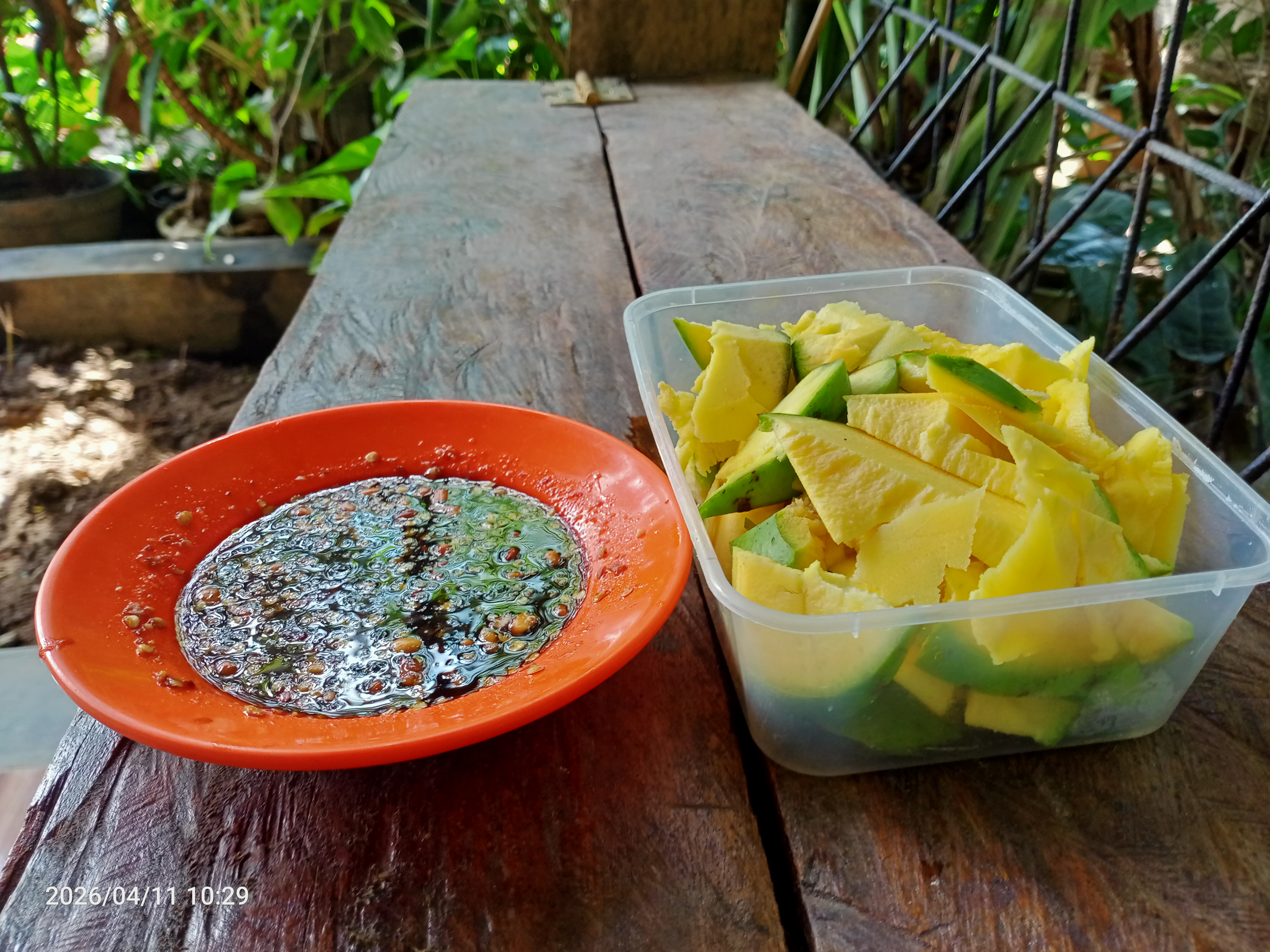 Di pagi menjelang siang ini aku juga membuat kan bumbu rujak dan memotong-motong sejumlah mangga untuk menemani ku beristirahat ketika sedang bekerja mengangkut tanah ini.