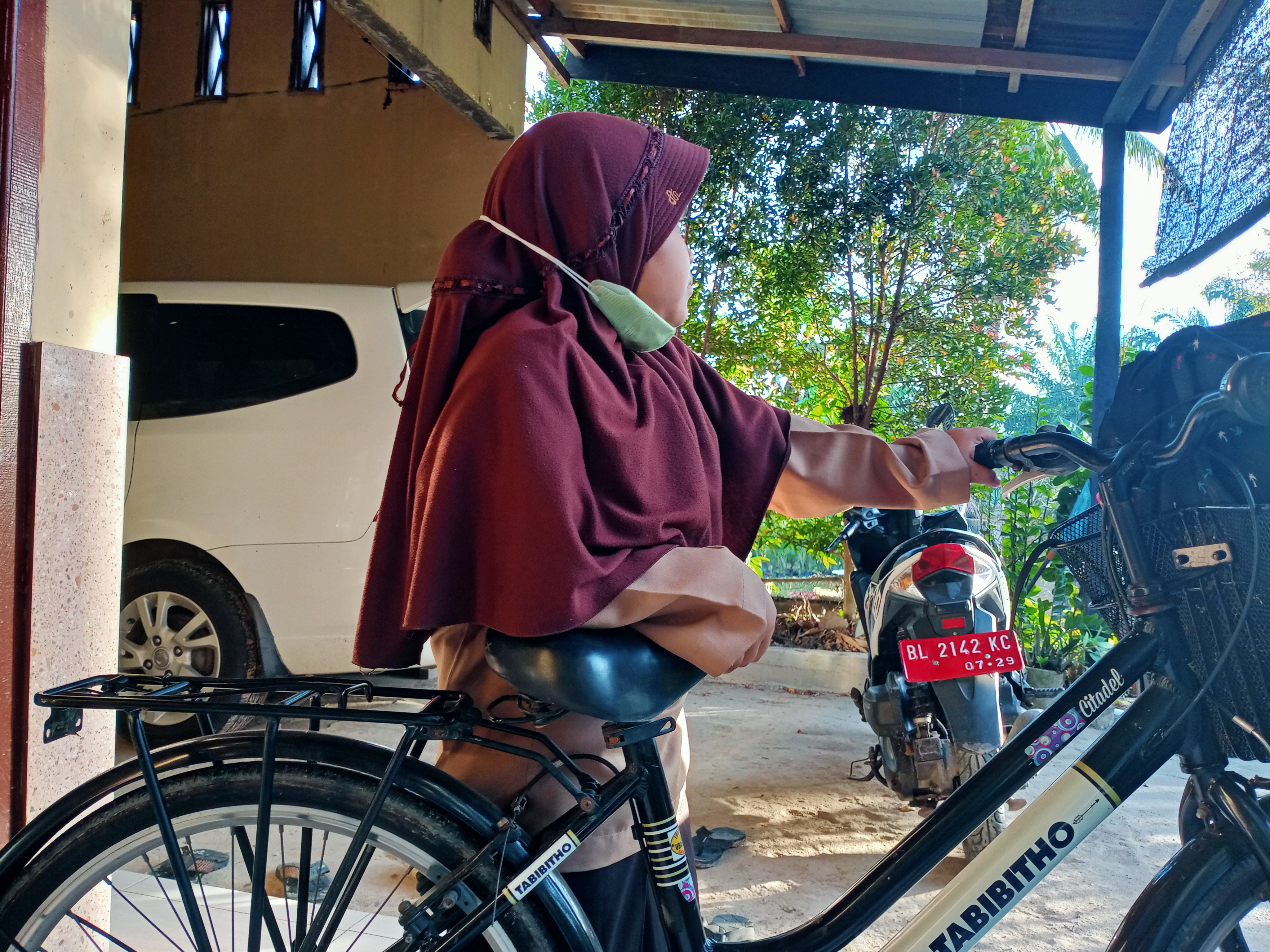 Dengan langkah yang mantap dan penuh semangat, dia mendorong sepedanya ke depan pintu pagar rumah kami dan kemudian mengayuh sepedanya menuju rumah sekolah yang berjarak sekitar 300 meter dari kediaman kami.