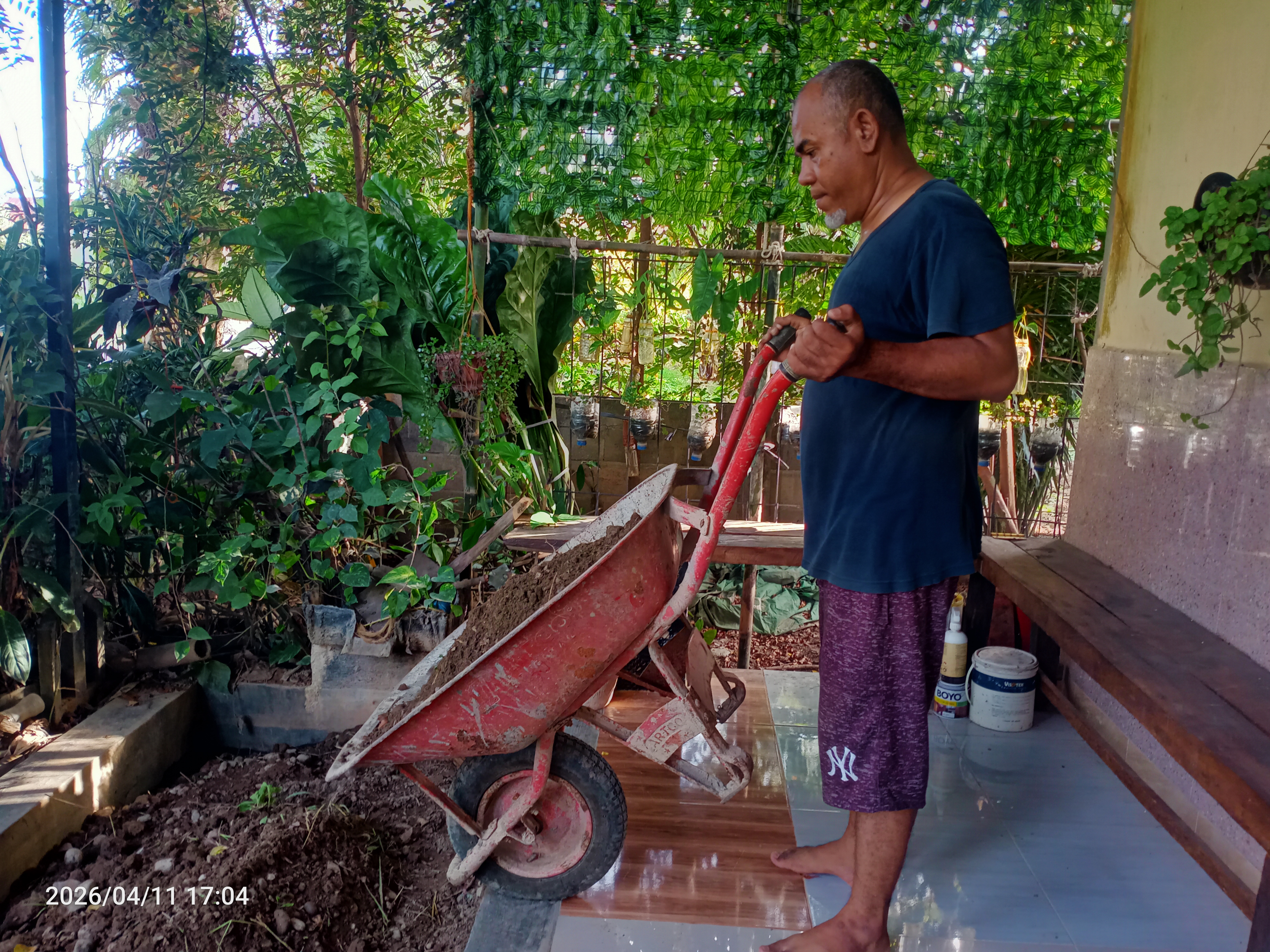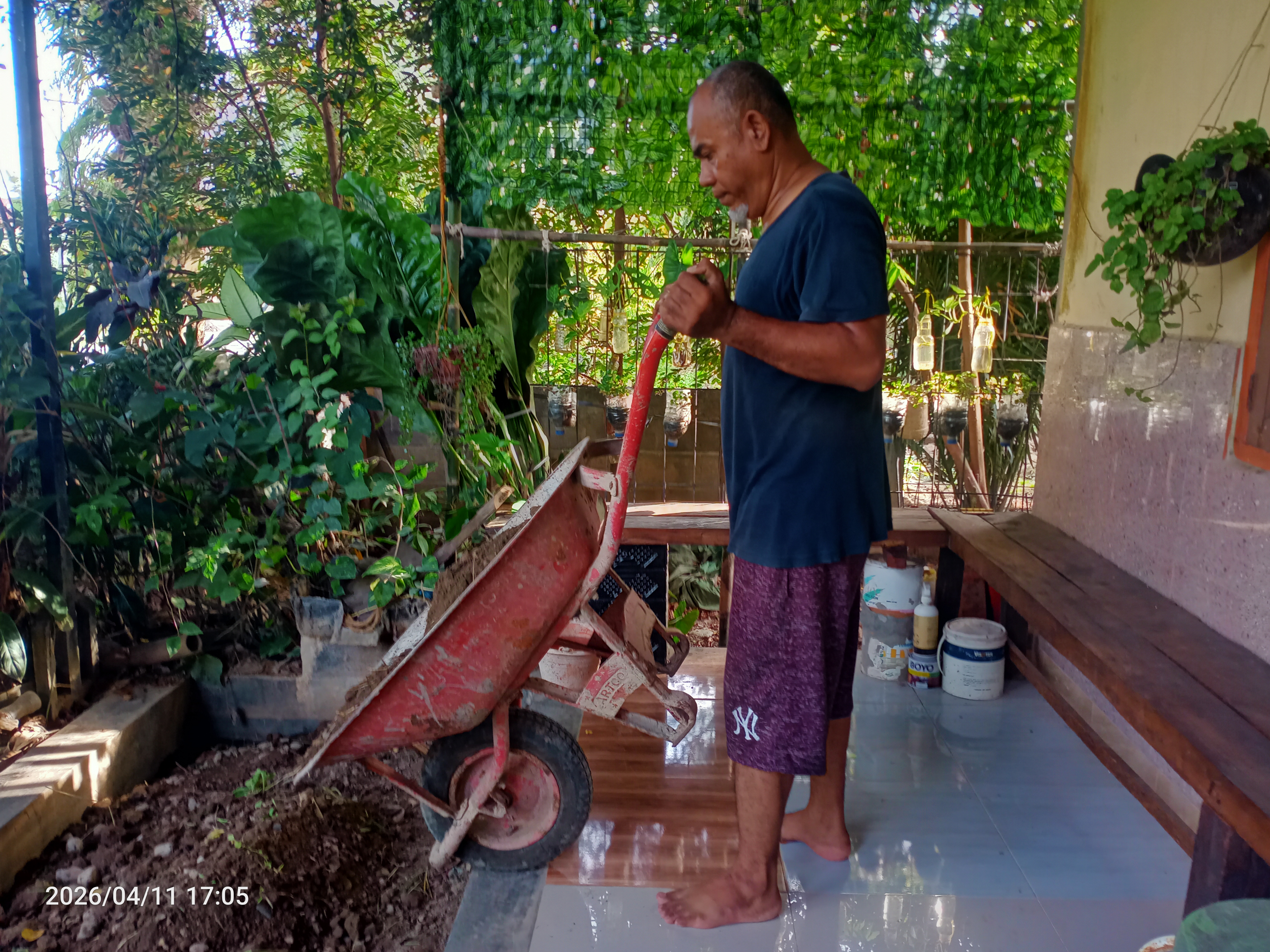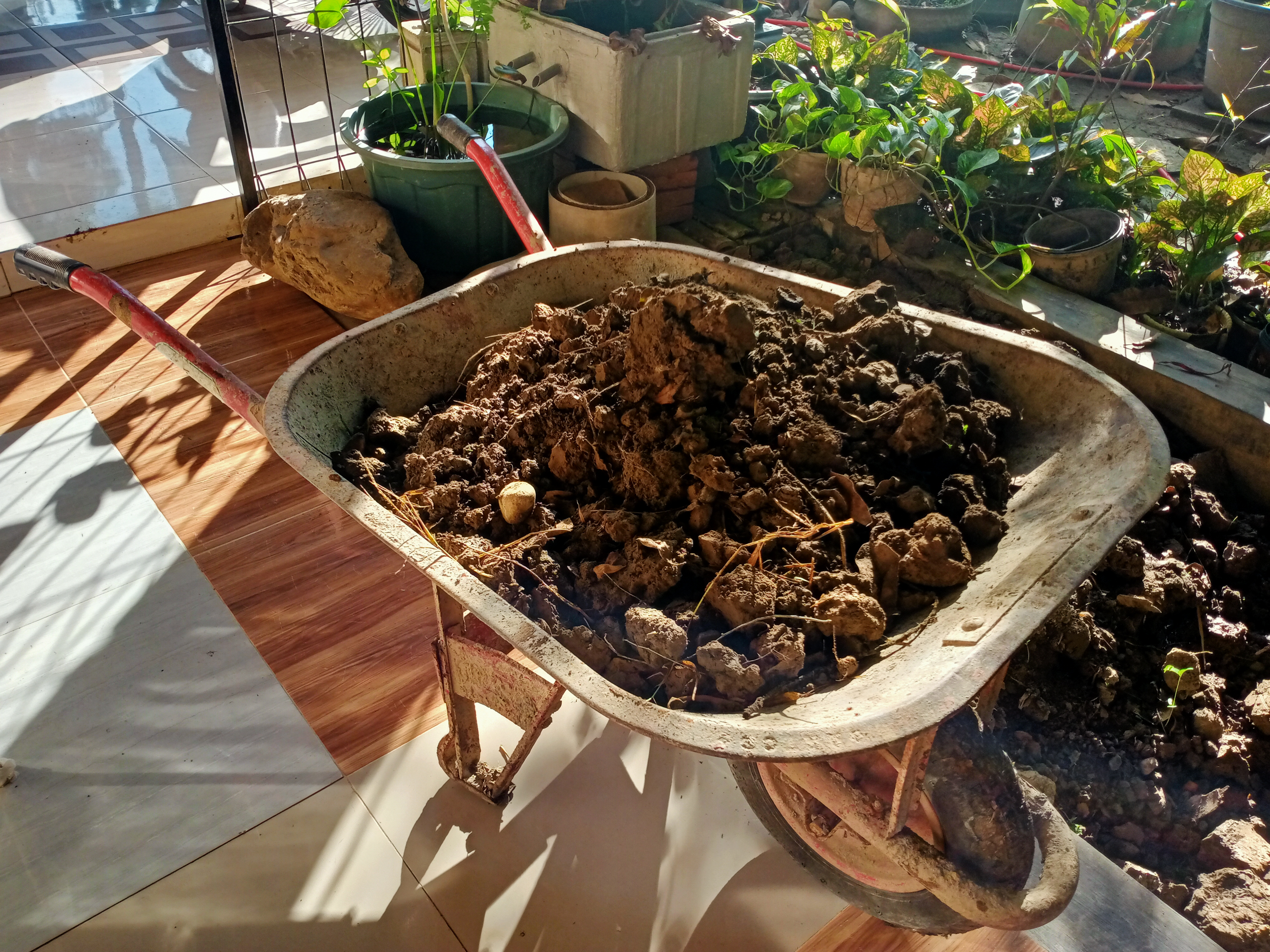 Kegiatan ku pada pagi ini masih dengan cara mengambil sisa endapan lumpur di parit yang sebagiannya telah ku angkat ke pinggir jalan itu, dan kemudian mengangkutnya dengan menggunakan gerobak dorong, sebagai material untuk menimbun eks kolam ikan koi milik kami.