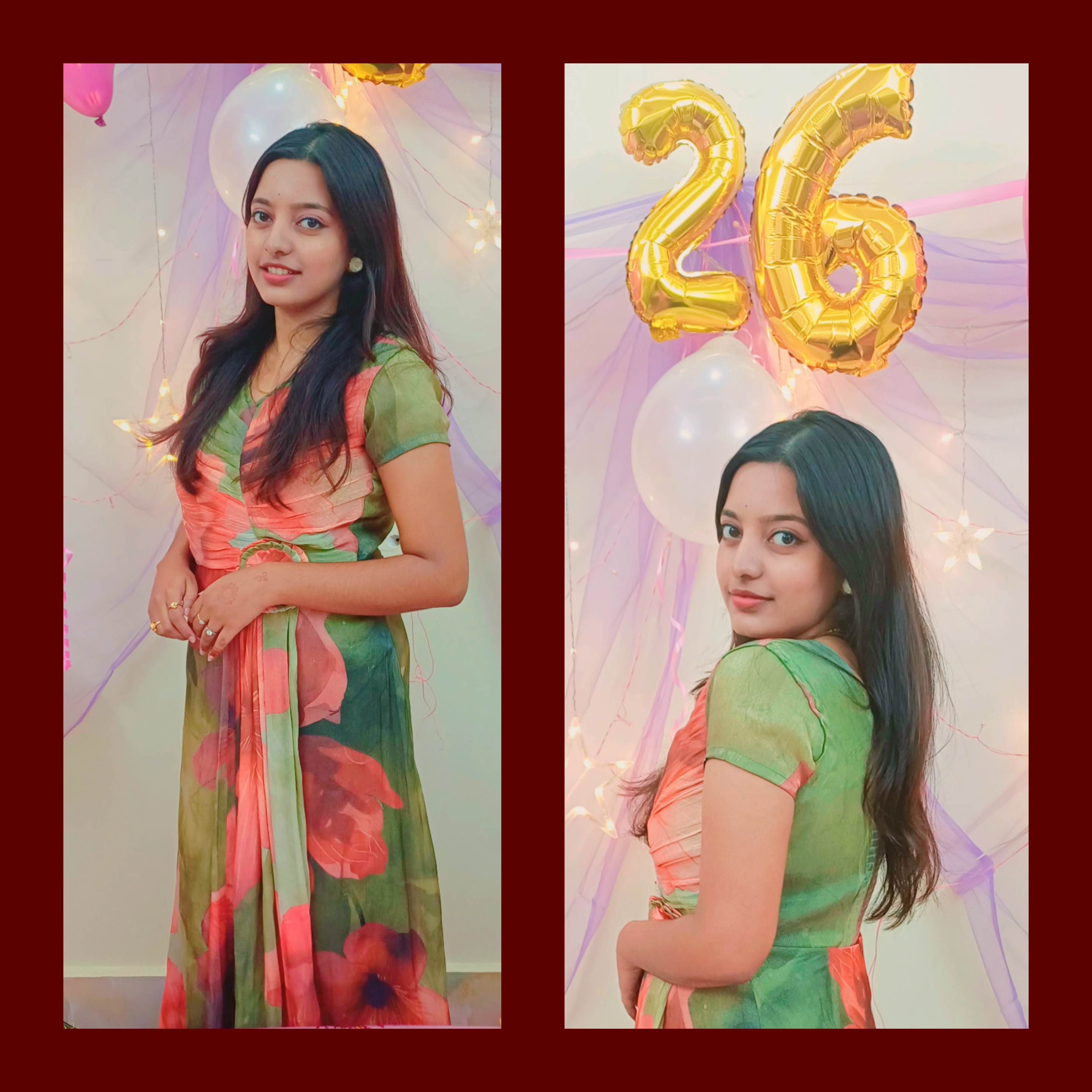 অবশেষে ভেবে নিয়েছিলাম জন্মদিন অবধি ড্রেসটা চুপচাপ আলমারির মধ্যে পড়ে থাক ।একদম জন্মদিনের দিন বার করব। ড্রেসটা খুবই সুন্দর। আমাদের কৃষ্ণনগরের নতুন মার্কেট আগমনী বাসন্তী বস্ত্রালয় থেকে কেনা। গাউন বলা যেতে পারে আবার লং ড্রেস বলা যেতে পারে ।তবে একটু আনকমন ধরনের কালার এবং ড্রেসের কোমরের দিকে একটা ফুলের মতন কাজ করা রয়েছে সেটাও খুব সুন্দর লাগে।