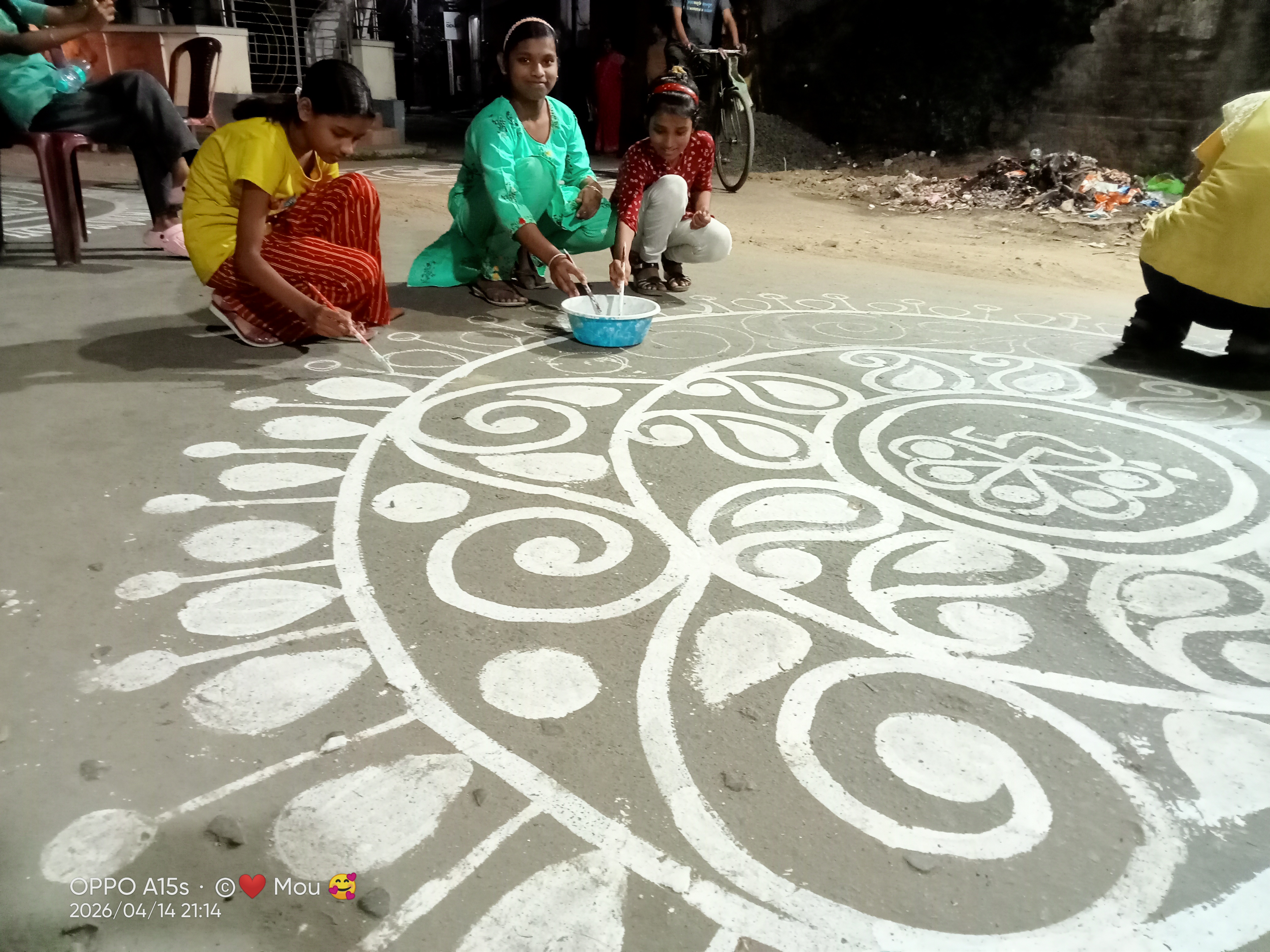 সন্ধ্যা থেকে ওখানে আবৃতি, গান সমস্ত কিছুর অনুষ্ঠান চলছিল ।তার সাথে ছোট ছোট বাচ্চাগুলো তাদের হাতের কাজ ফুটিয়ে তোলার চেষ্টা করছিল। অনেকটা রাস্তা জুড়ে আঁকা চলছিল।বিভিন্ন রকমের কলকা ডিজাইন আঁকার চেষ্টা চলছিল। প্রচন্ড গরম থাকলেও বেশ সুন্দর ঠান্ডা ঠান্ডা হাওয়া বইছিল। বাচ্চাগুলোর যাতে কষ্ট না হয়। যাইহোক গিয়ে চারিদিকে খানিকক্ষণ ঘোরাঘুরি করে তাদের প্রতিভা গুলোই আমার বারবার চোখে পড়ছিল। অনেকক্ষণ ঘোরাঘুরি করে তাদের আঁকাগুলো দেখছিলাম। বোনকে বাড়ি আসার জন্য বলেছিলাম। কিন্তু বোন আসতে রাজি হলো না ।কারণ অনেক ছোট ছোট বাচ্চাটা ছিল তাদের সাথে বেশ মজাই পাচ্ছিল।