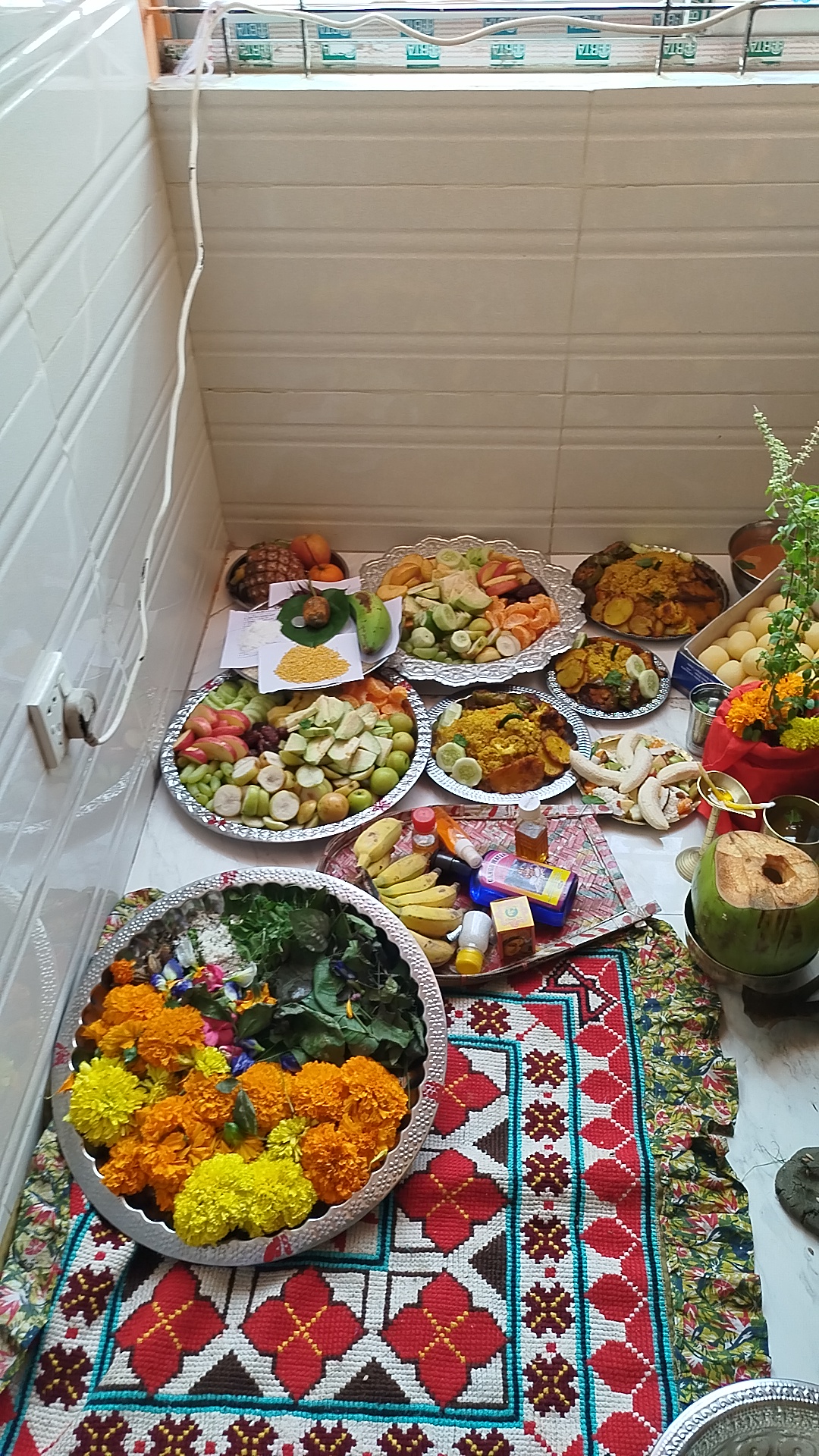 আজকে প্রসাদের জন্য অনেক কিছু আয়োজন ছিল, সরষে পোস্ত দিয়ে সিম ভাপা ,বেগুনি ,আলু ফুলকপি দিয়ে সয়াবিন তরকারি, মুগডাল, বিভিন্ন রকম সবজি দিয়ে একটি ভাজি ,মিষ্টান্ন ,চাটনি, ফ্রাইড রাইস। এগুলো সব দাদাভাই একা রান্না করেছেন, তবে আমরা তাকে কাজে অনেক সাহায্য করেছিলাম।