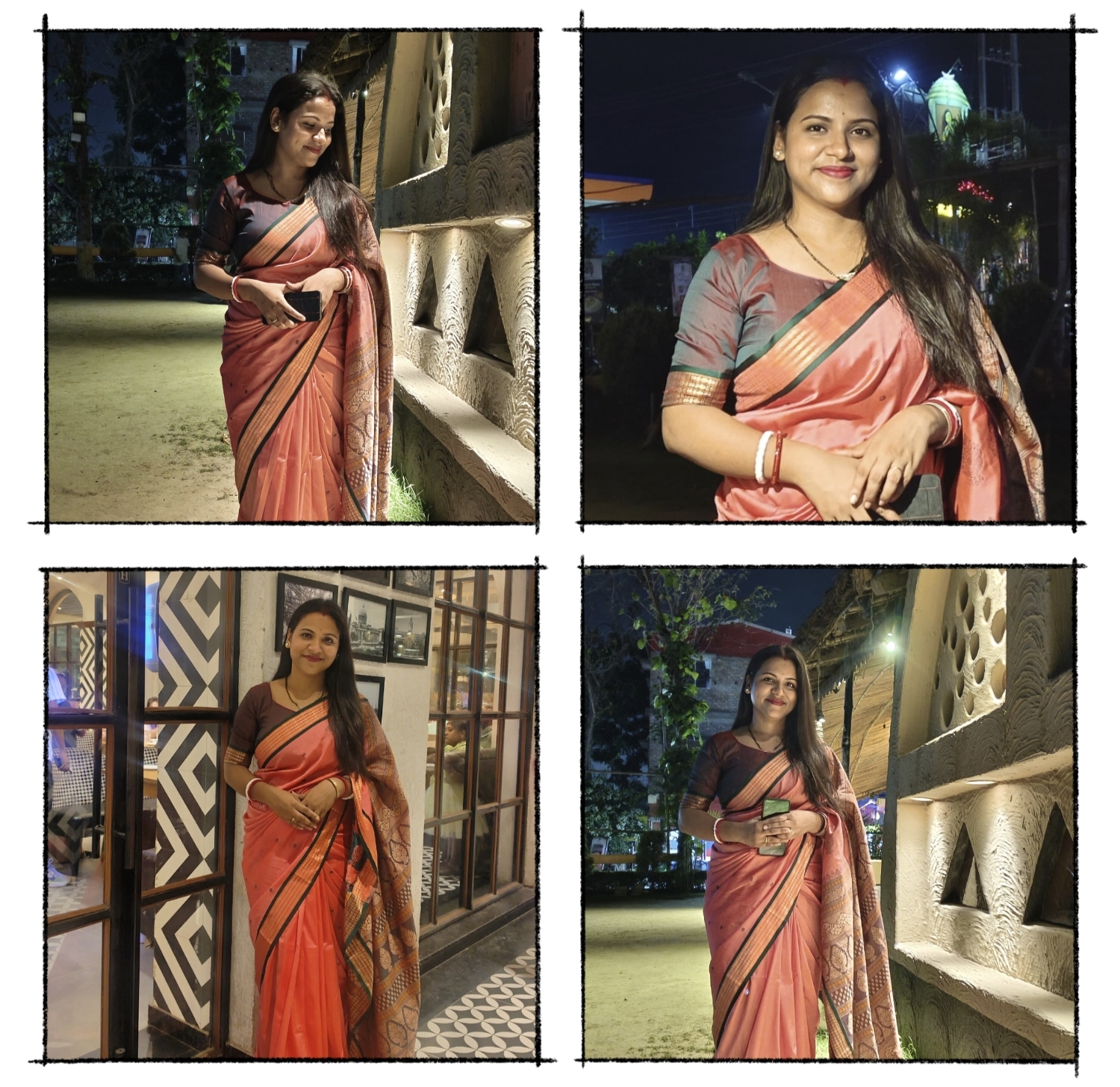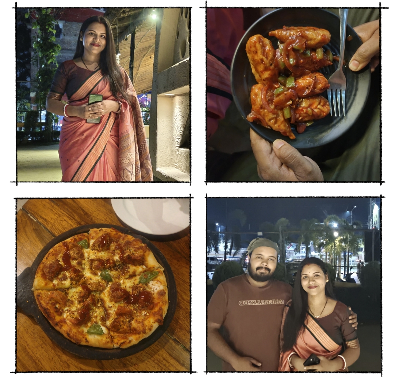 মোমো খেয়ে আমরা চলে গিয়েছিলাম আমাদের শহরের একটি খুব বিখ্যাত রেস্টুরেন্টে যার নাম ' মাদার্স হাট'। সেখানে গিয়েই তো চক্ষু চড়ক গাছ। কারণ প্রচন্ড ভিড় ছিল। তাই আমরা প্রথমেই ঠিক করলাম কিছু ফটো তুলব। তারপর রেস্টুরেন্টের ভিতরে ঢুকবো। সেইমতো আমি আর আমার বর মিলে কয়েকটা ফটো তুলছিলাম। খাওয়া দাওয়ার পরে আর ফটো তুলতে মন চায় না তাই আগে থেকেই ফটো তুলে নিয়ে ছিলাম। আর যেহেতু শাড়ি পরাই হয় না, তাই অনেকদিন পর শাড়ি পরে ফটো তুলতে বেশ ভালোই লাগছিল।