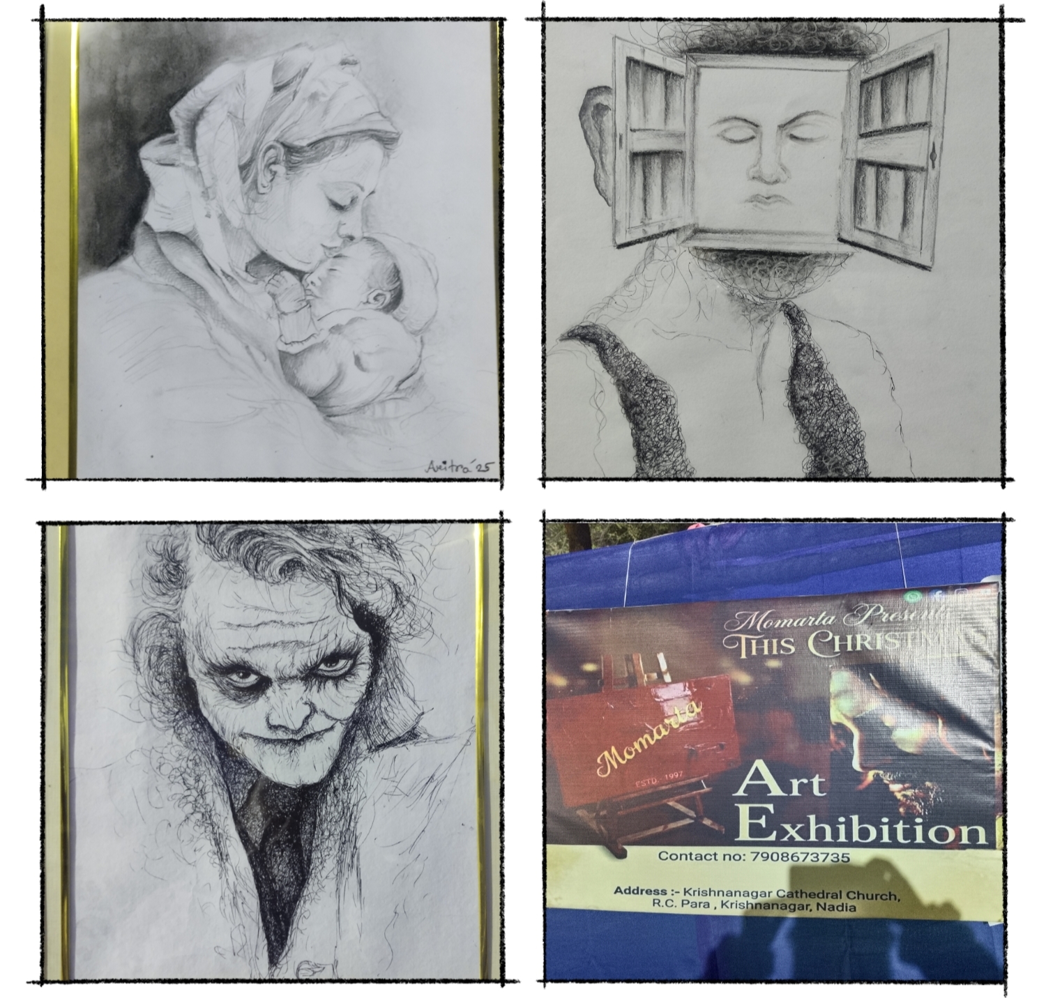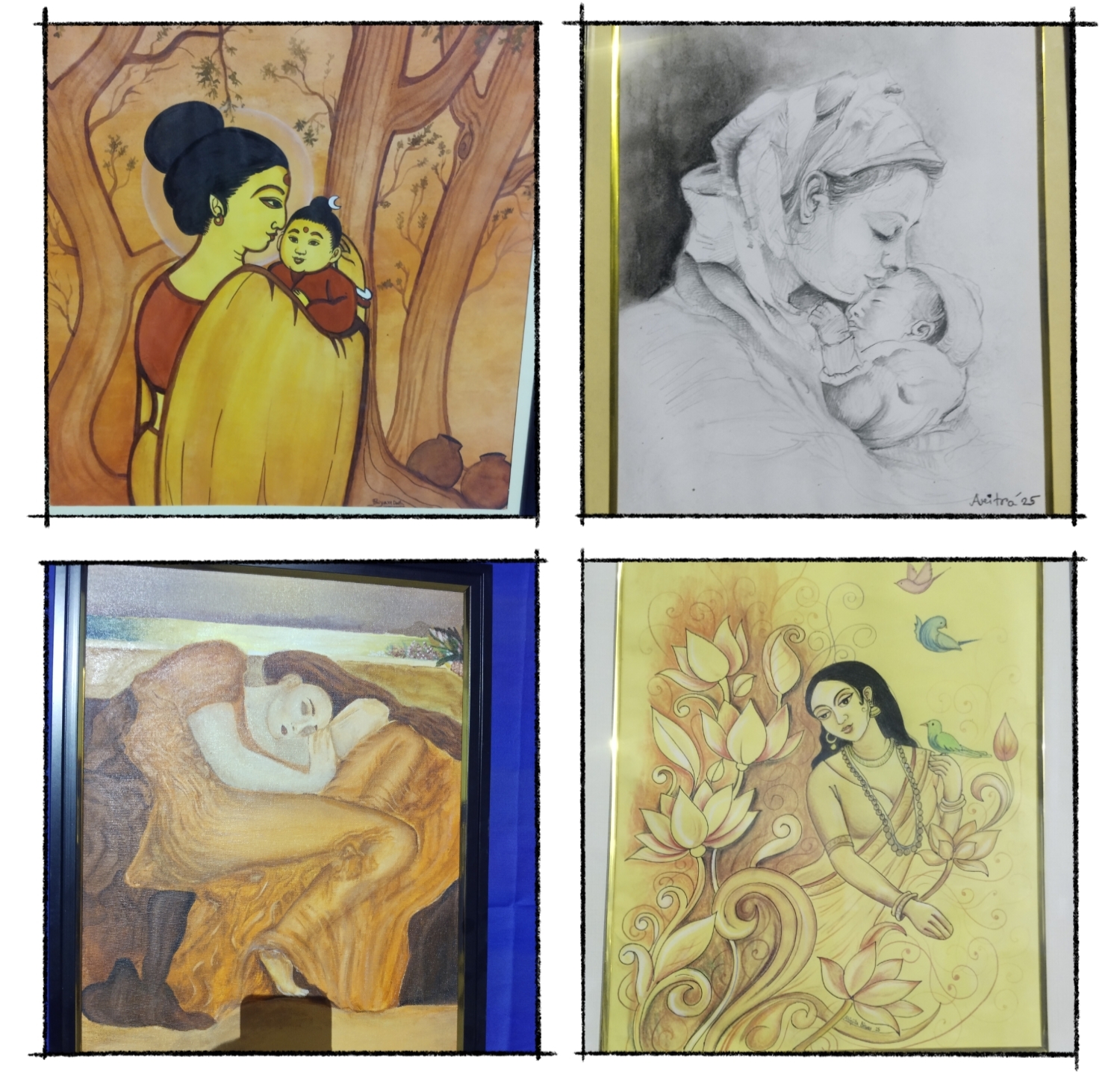 প্রথমেই শেয়ার করব যে ছবিগুলি তার মধ্যে দুটি ছবিতে দেখানো হয়েছে, বাচ্চার প্রতি মায়ের ভালোবাসা। পৃথিবীর এমন কোন প্রজাতি নেই, যেখানে মা তার সন্তানকে ভালোবাসে না। সন্তানের প্রতি মায়ের ভালোবাসা অসীম, অফুরন্ত। আর সেই ভালোবাসাকেই সুন্দর করে ফুটিয়ে তোলা হয়েছে ছবির মাধ্যমে। পেন্সিলে স্কেচ করা ছবিটিতে মায়ের মমতা, ভালোবাসা যেন আরো অনেক সুন্দর করে প্রকাশ করা হয়েছে। এই দুটি ছবিই আমার খুব ভালো লেগেছিল। এরপর আরো দুটি ছবি আমি আপনাদের সামনে তুলে ধরেছি। সেখানে পৌরাণিক যুগের দুইজন মানবীর ছবি ফুটিয়ে তোলা হয়েছে। আর্ট এক্সিবিশন এর প্রত্যেকটি ছবিতেই শিল্পীদের নিখুঁত শিল্পকর্ম সুন্দরভাবে প্রকাশিত হয়েছে।