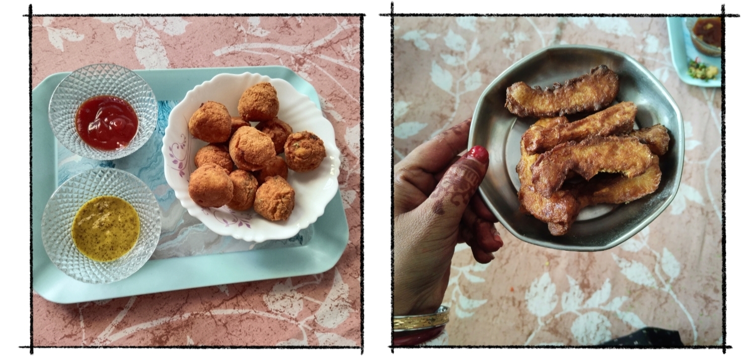এরপর দেখি সাজিয়ে গুছিয়ে প্লেটে করে আমাদের জন্য কচুরি, তরকারি ও মিষ্টি আনা হয়। কিন্তু আমি আর আমার বর যেহেতু কিছুক্ষণ আগেই পেট ভরে খেয়ে এসেছিলাম তাই আমাদের পক্ষে আবার খাওয়া একেবারেই সম্ভব ছিল না। আর সেই দিন সেখানে কোন খাবার আয়োজন ছিল সেটা আমার বর আমাকে আগে থেকে বলেইনি। তাহলে হয়তো প্রথমের নিমন্ত্রণটাতে পরে যেতাম। যাইহোক, আমরা না খেতে চাইলেও অল্প করে খেতেই হয়েছিল। কচুরি ,মিষ্টি শেষ করতে না করতেই দেখি ফিশ বল ও ফিশ ফিঙ্গার নিয়ে হাজির। সেই মুহূর্তে এত ভালো ভালো খাবার দেখেও একেবারেই খেতে মন চাইছিল না কারণ অলরেডি পেট ভরে গিয়েছিল। কিন্তু এত কষ্ট করে বানিয়েছিল তাই একটু টেস্ট করতেই হয়েছে। দুটো আইটেমই দারুন বানিয়েছিল।