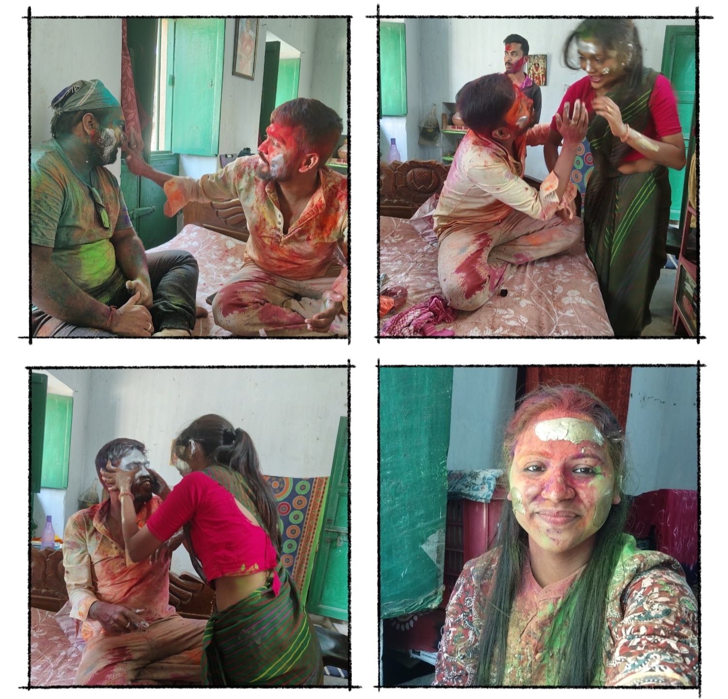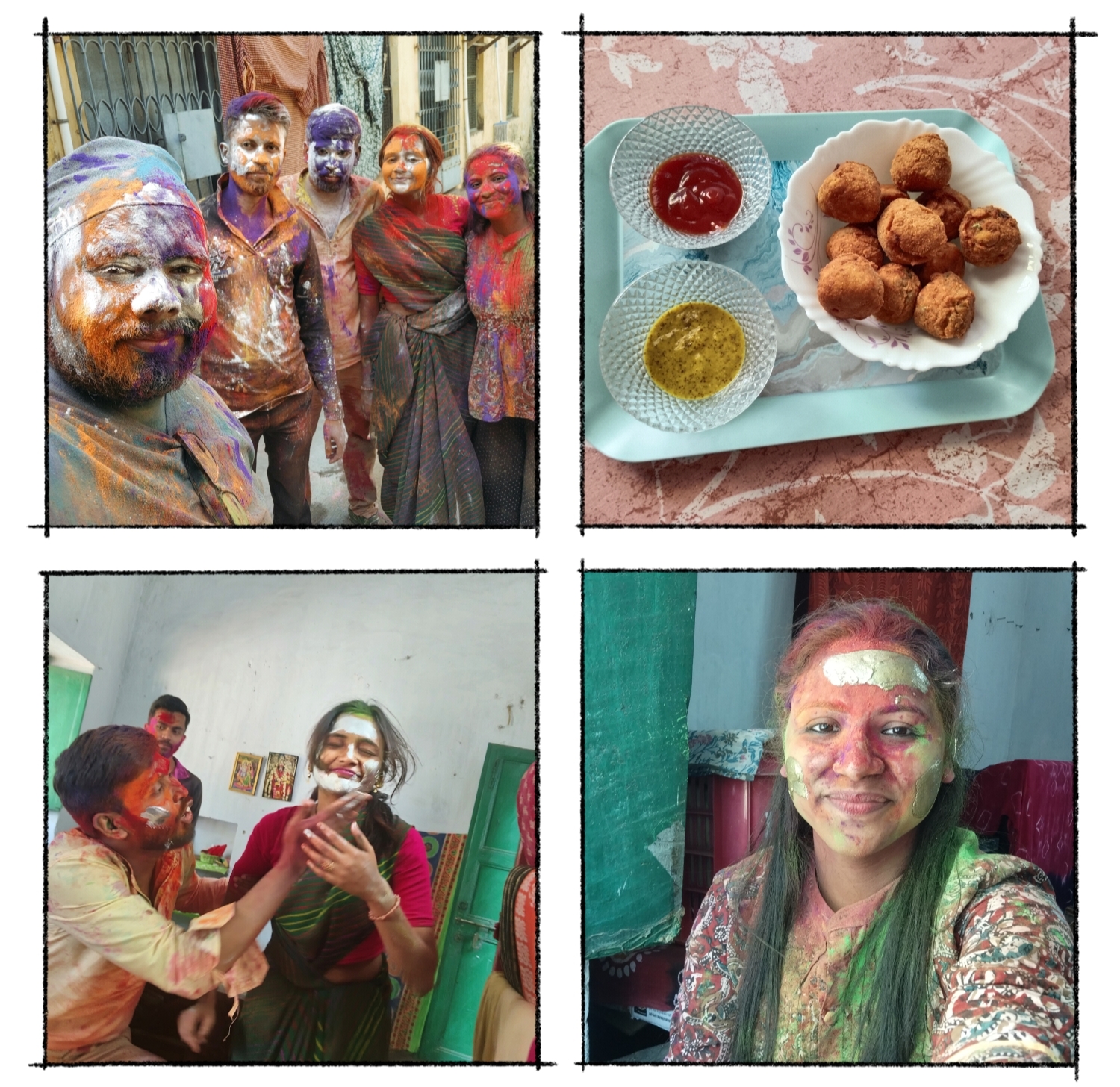 এইভাবে বেশ কিছুক্ষণ সময় কাটানোর পর, আবার শুরু হয় রং খেলার শেষ পর্ব। বাইরে উঠোনে বেরিয়ে সকলে মিলে আমরা দারুণ রং মাখামাখি করেছিলাম। আমরা নিজেরাই নিজেদেরকে চিনতে পারছিলাম না। কি সাংঘাতিক যে রং রেখেছিলাম কি বলবো। রং মেখে সেই দিনটাকে স্মৃতির পাতায় ধরে রাখার জন্য আমরা বেশ কয়েকটা ফটোও তুলেছিলাম। রং মেখে, ফটো তুলে , গল্প করে সময় কাটানোর পর ফেরার আগে আবার ছিল খাবারের আয়োজন। দুপুরের মেনুতে ছিল, মটন কষা, সাদা ভাত, কাতলা ভাপা আরও কত কি। এত খাবার কি একদিনে খাওয়া যায়! তবুও সকলেই নাছোড়বান্দা। তাই অল্প করে খেতেই হয়েছিল।