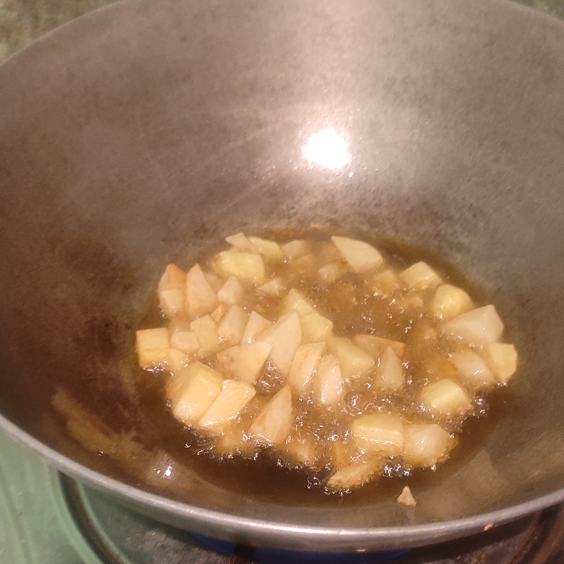 ৬)এরপরে তেল গরম হলে তারমধ্যে আলু আর নারকেল গুলো ভেজে নিতে হবে।