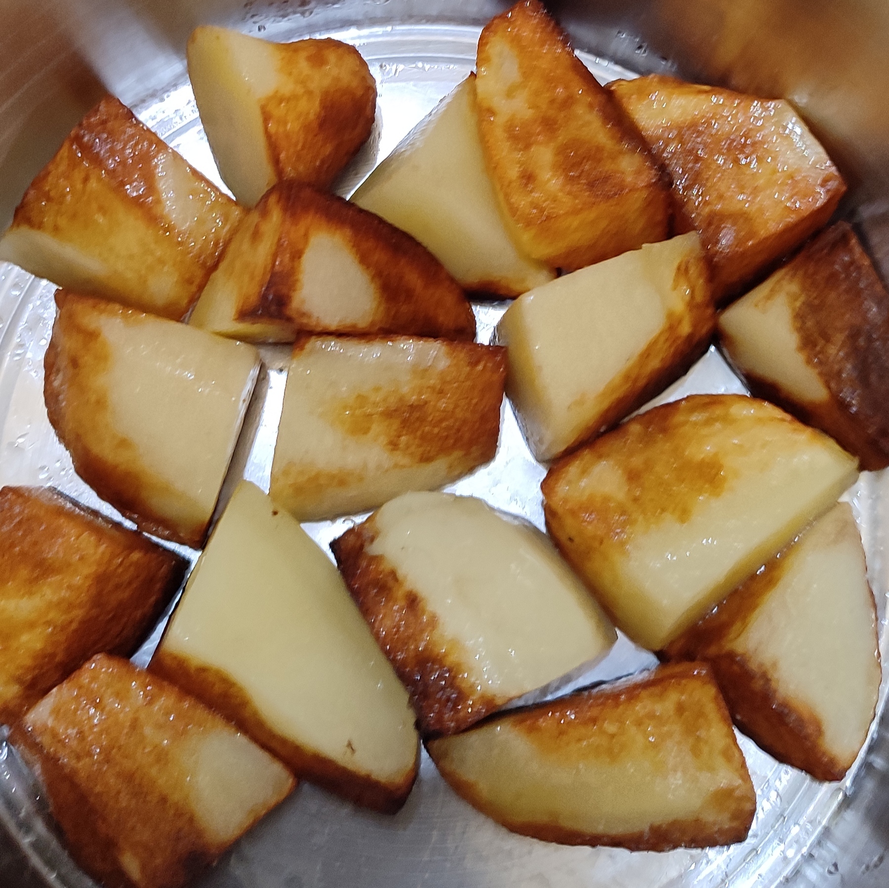 ৮)এরপর বাকি তেলের মধ্যে আলুগুলো ভেজে একটা পাএে নামিয়ে রাখতে হবে।