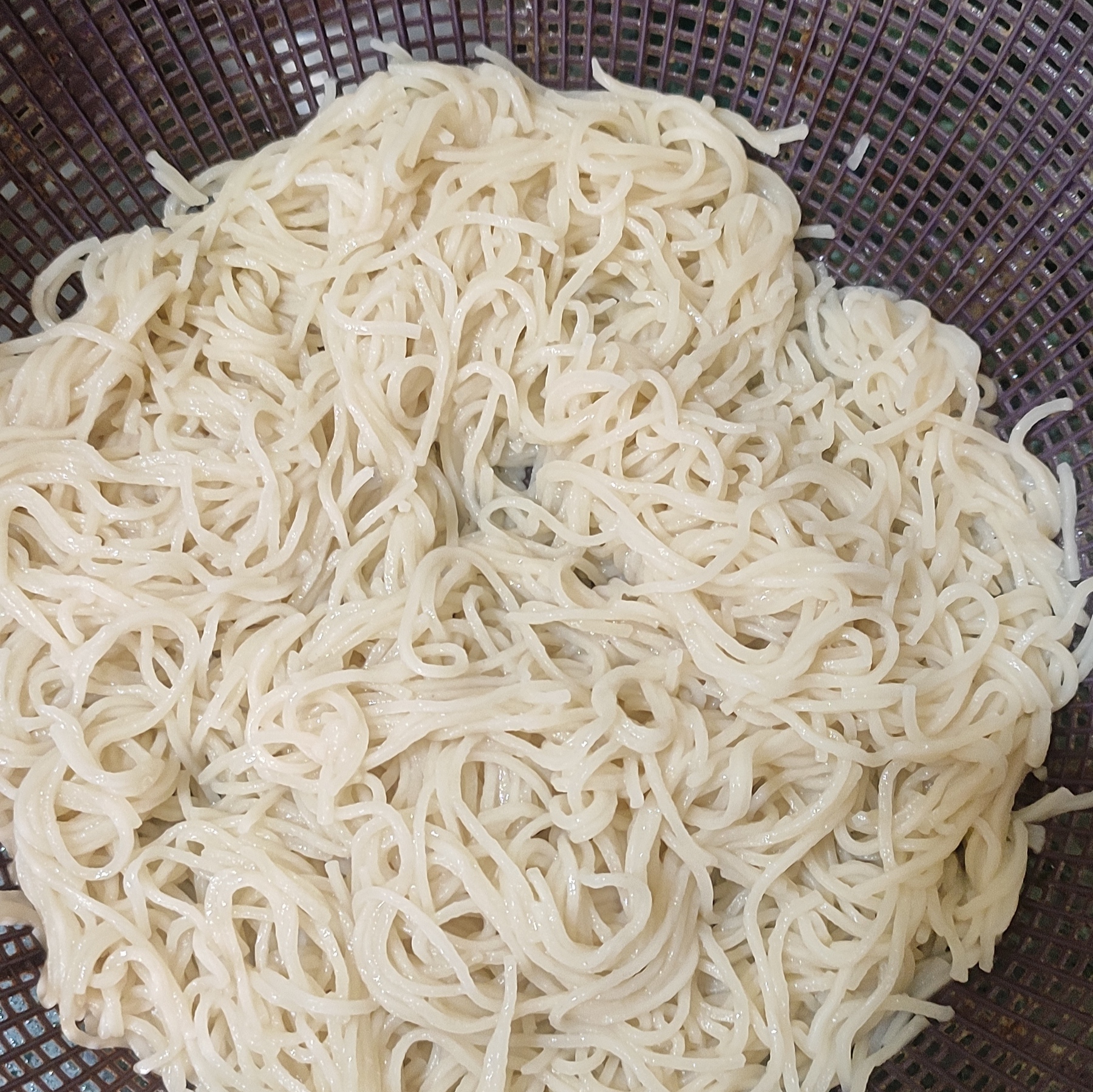 6)চাউমিনটা একটু হালকা সেদ্ধ হয়ে গলে সেটা একটা ঝুড়িতে নামিয়ে জলটা ঝড়িয়ে নিতে হবে।