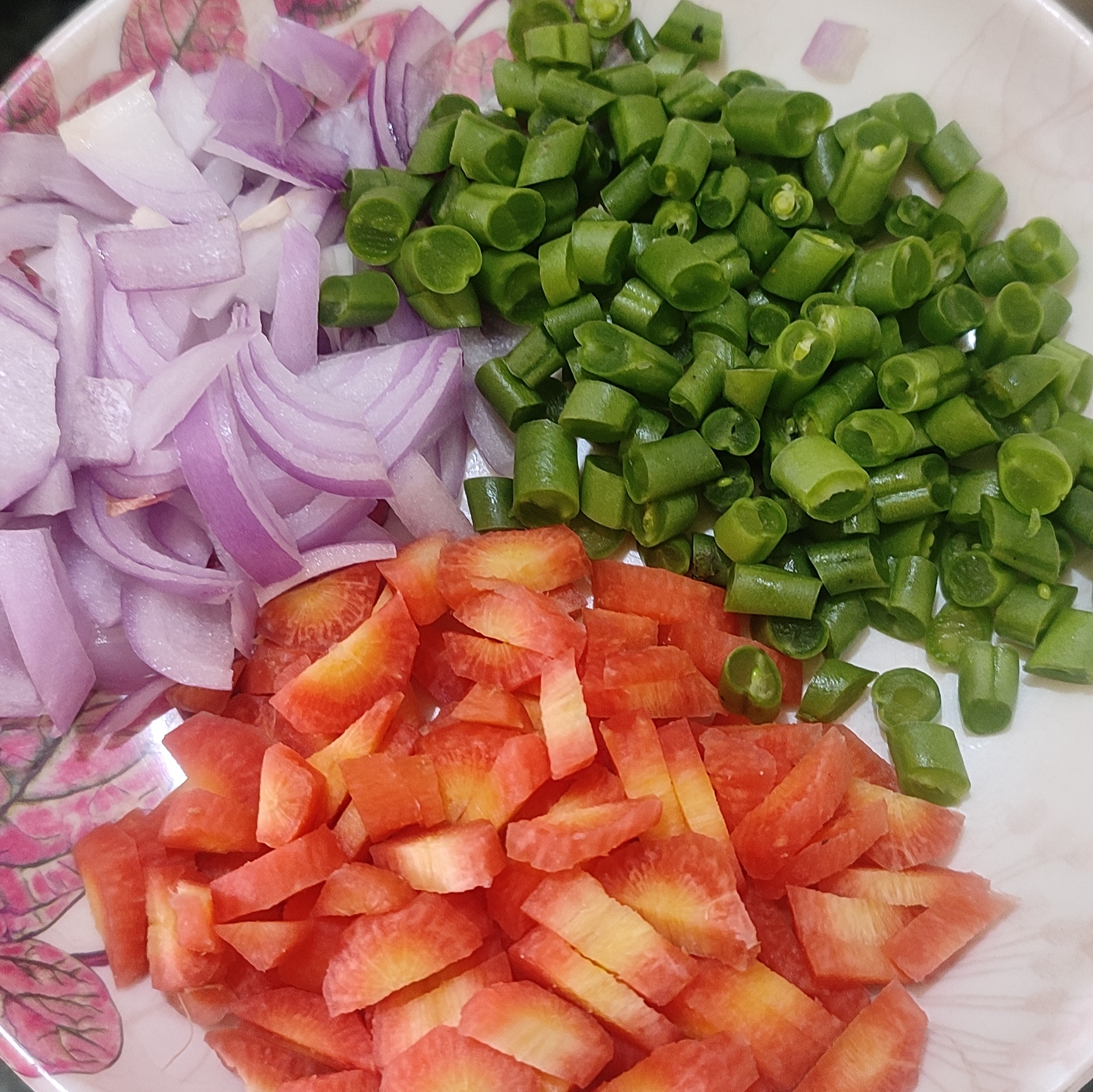 2)তারপর বিনস, গাজর আর পেয়াজ গুলো ছোট ছোট করে কেটে নিতে হবে।