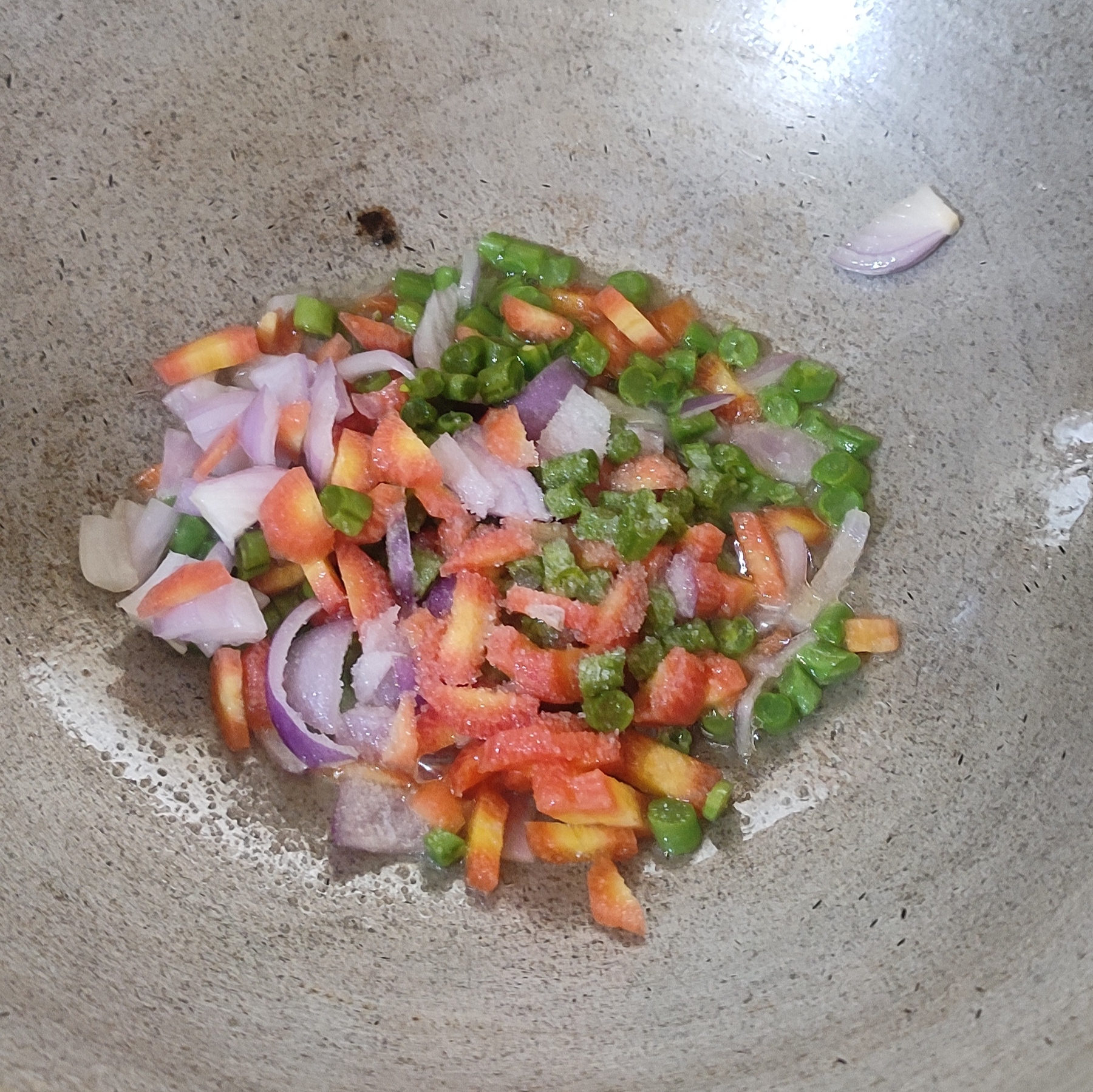 8)কড়াইটা গরম হলে তার মধ্যে তেল দিয়ে দিতে হবে। আর যখন তেল গরম হবে তখন তারমধ্যে পেয়াজ, বিনস, গাজর আর কাঁচালঙ্কা দিয়ে সেটা ভালোকরে ভেজে নিতে হবে।