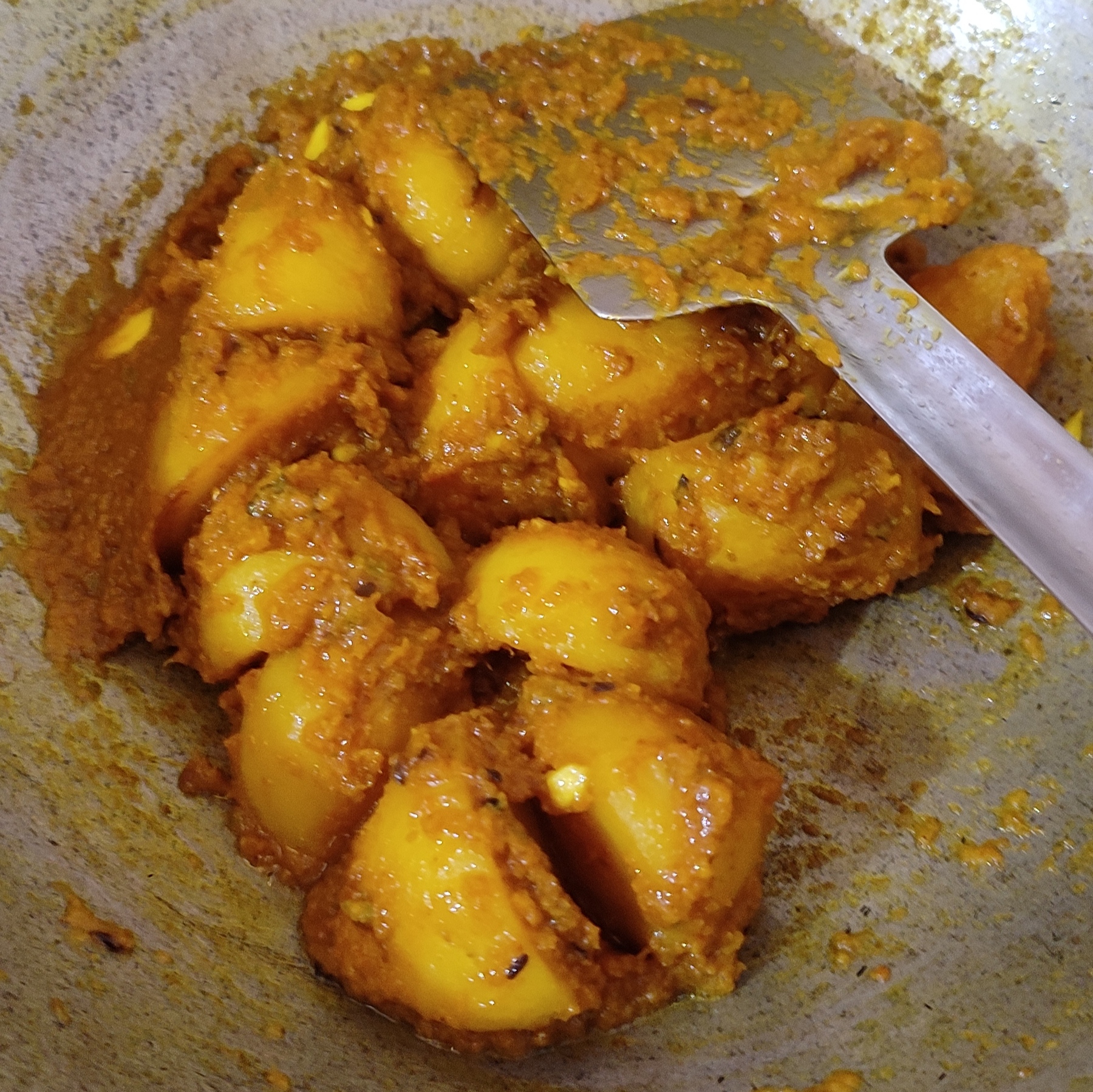 9)মশলাটা ভালোকরে যখন কষেযাবে তার মধ্যে আলুগুলো দিয়ে একটু নেড়ে চেড়ে নিতে হবে।