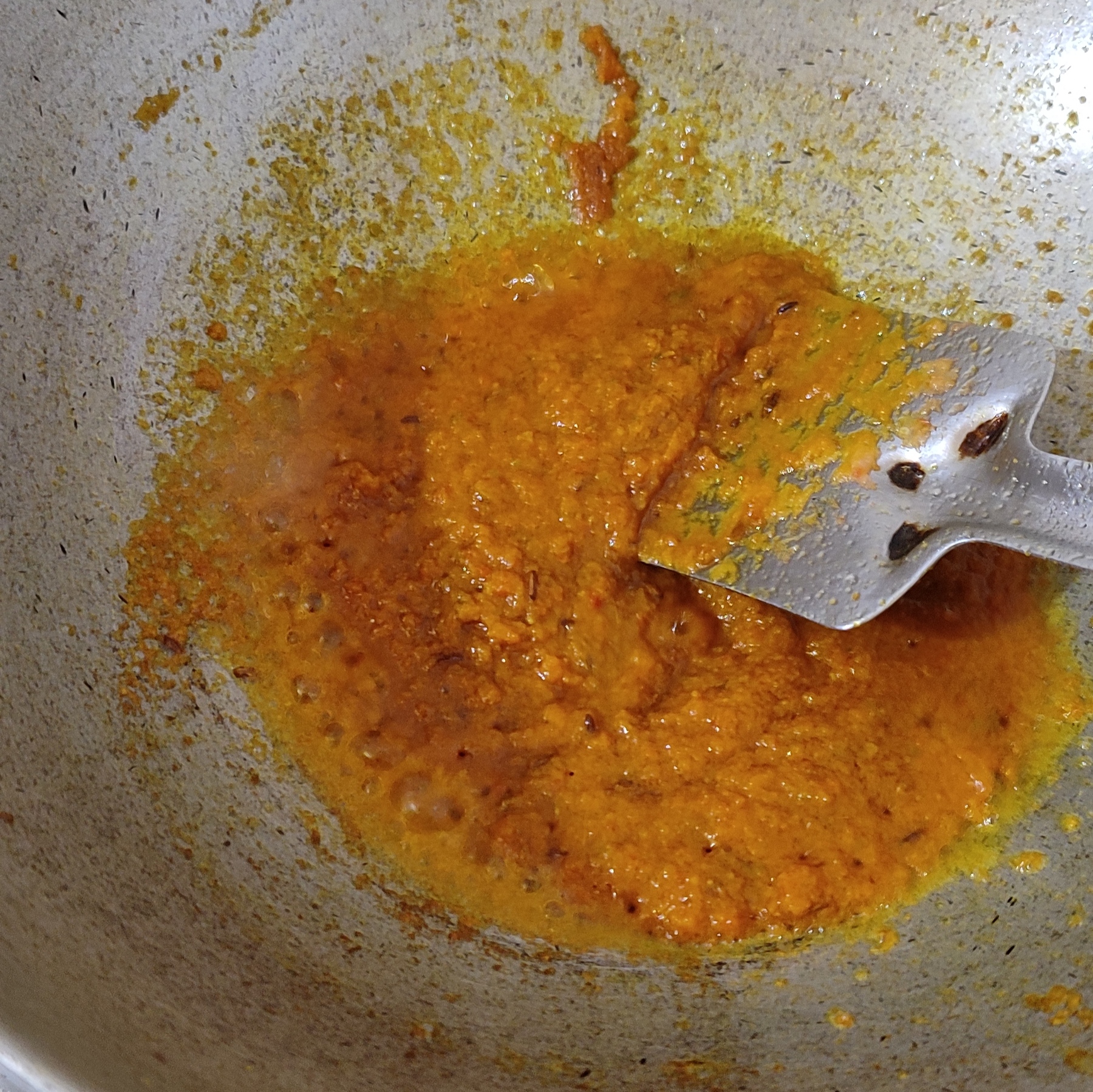 8)এরপর তারমধ্যে নুন, হলুদ ও একটু মিষ্টি দিয়ে সেটা ভালোকরে কিছুক্ষণ কষাতে হবে।