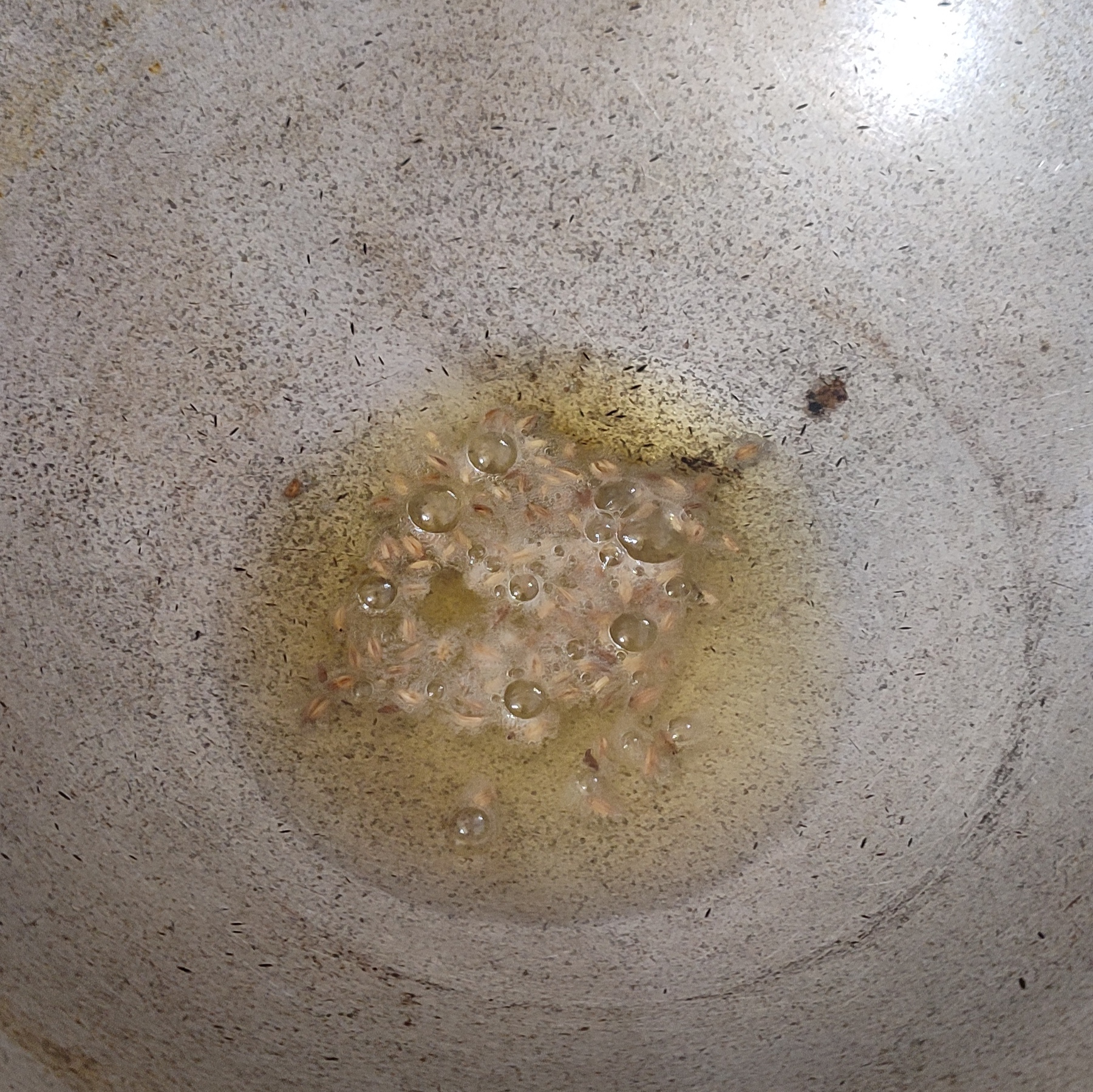 6)ওই অবশিষ্ট তেলেরমধ্যে আরেকটু তেল দিয়ে তারমধ্যে গোটাজিরে ফোরন দিতে হবে।