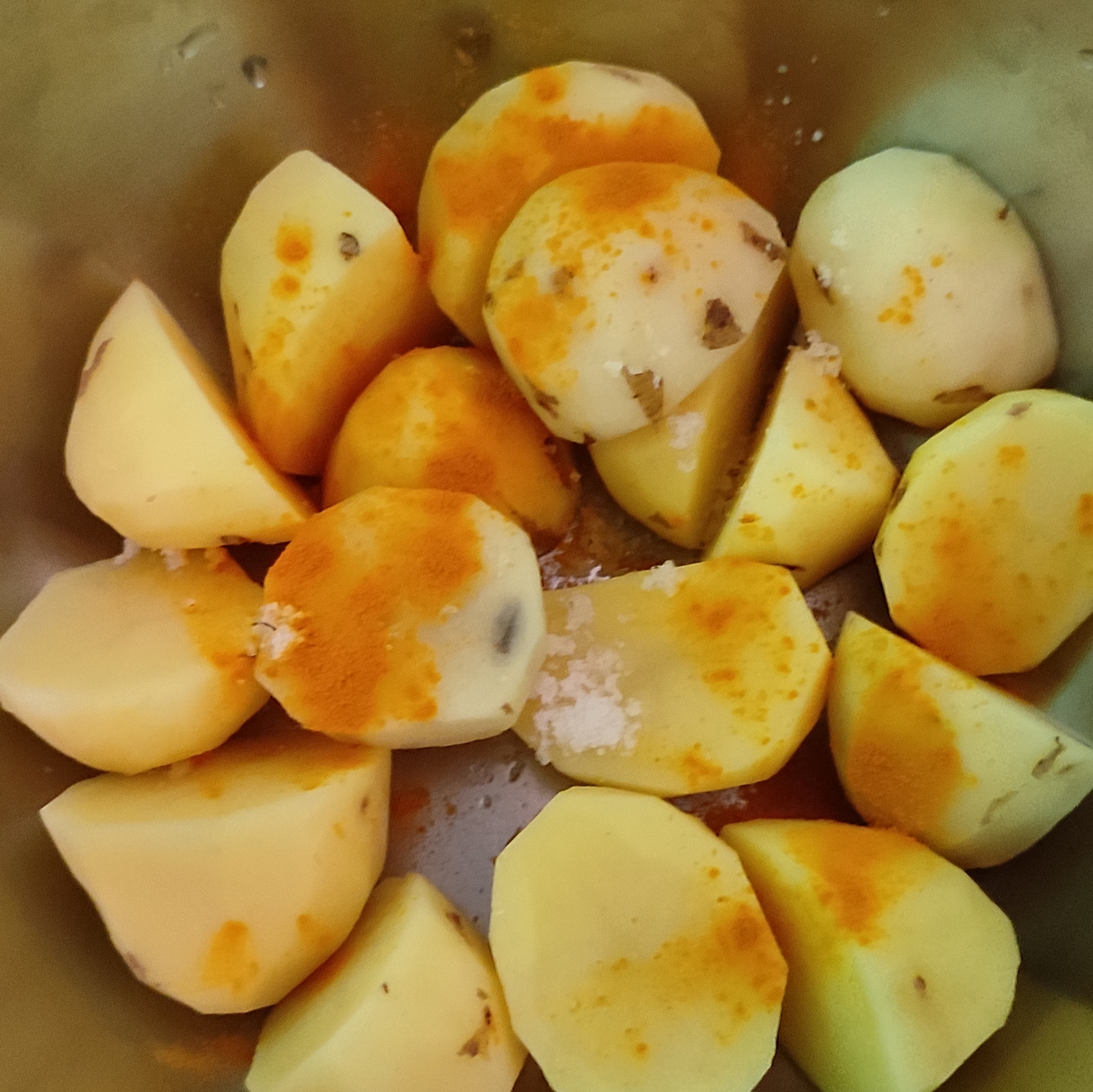 ৪)এবার আলুর মধ্যে নুন আর হলুদ মাখিয়ে সেটা একটা পাএে রাখতে হবে।
