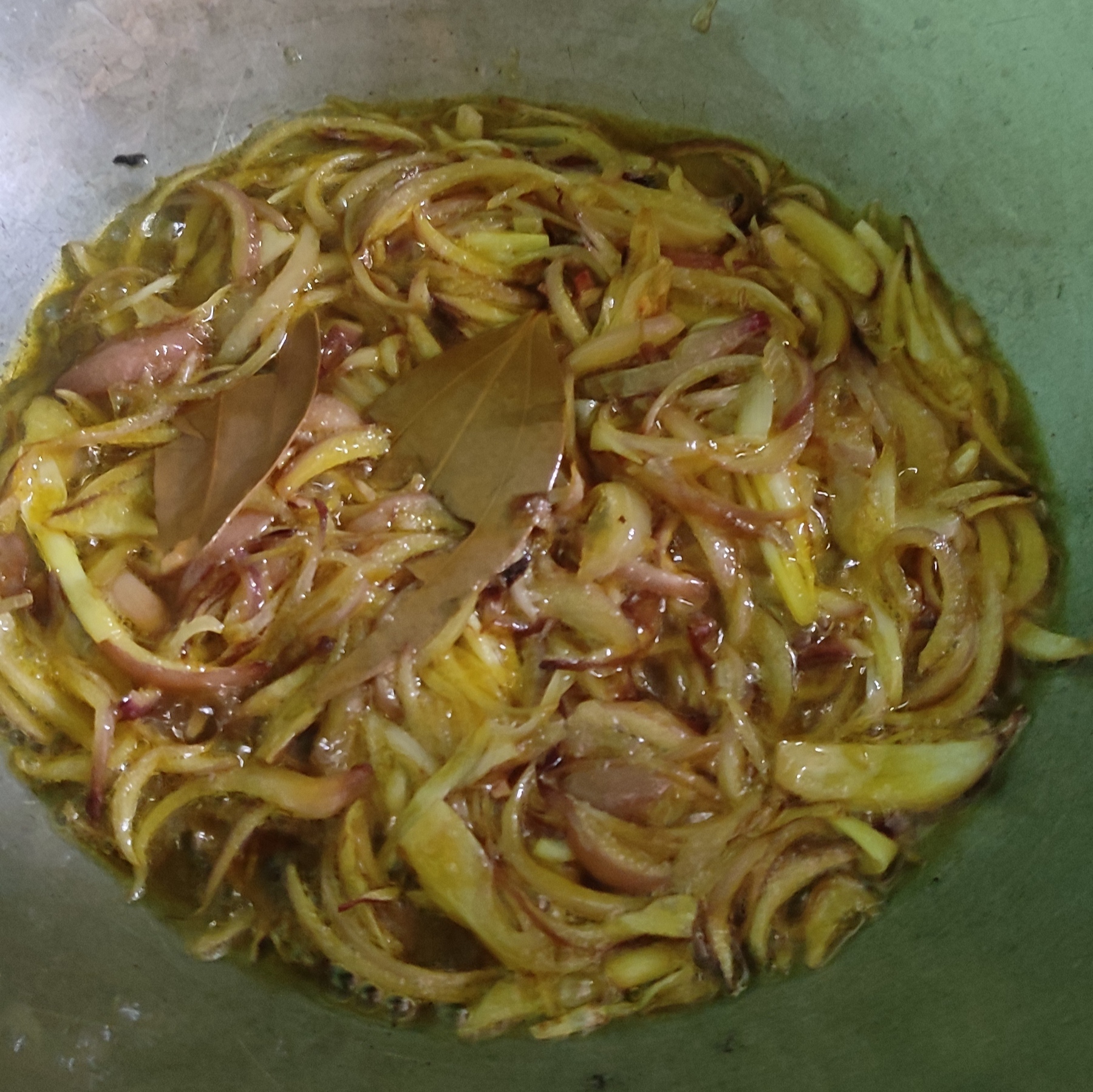 ৬)তারপর ওই অবশিষ্ট তেলটির মধ্যে আরেকটু তেল দিয়ে তেজপাতা ফোরন দিতে হবে।
