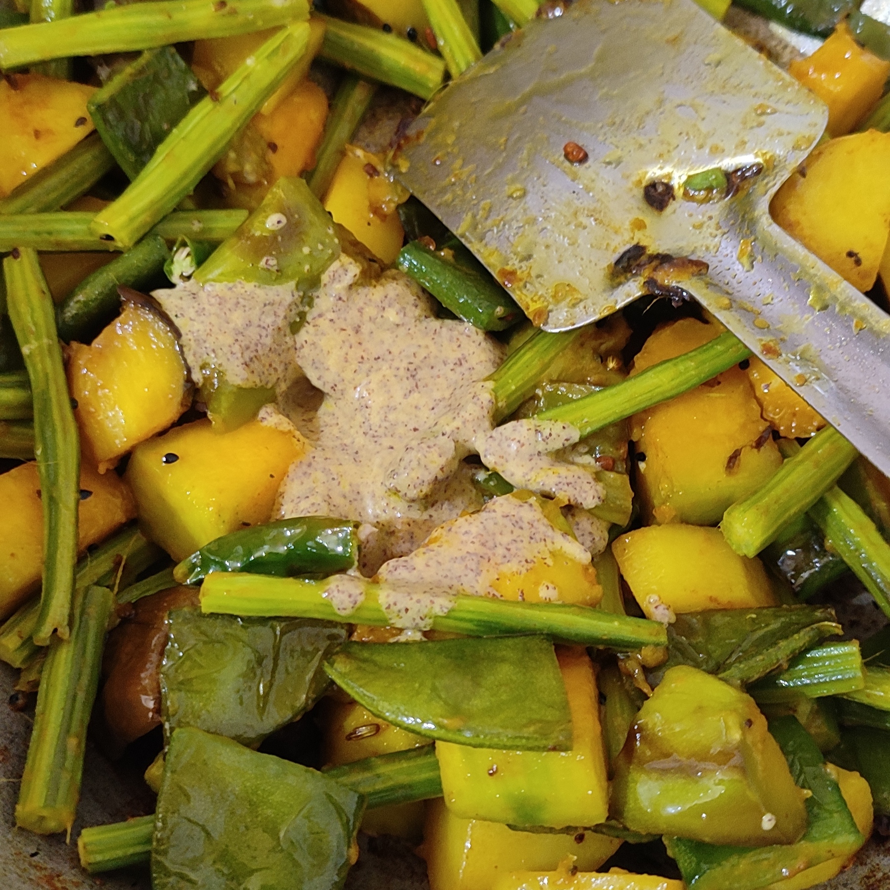 ৮)তারপর সবজি গুলো ভালো করে কষে গেলে তার মধ্যে সজনের ডাটা গুলো দিয়ে আরও কিছুক্ষণ নেড়ে চেড়ে তার মধ্যে সরষে বাটাটা দিয়ে দিতে হবে।