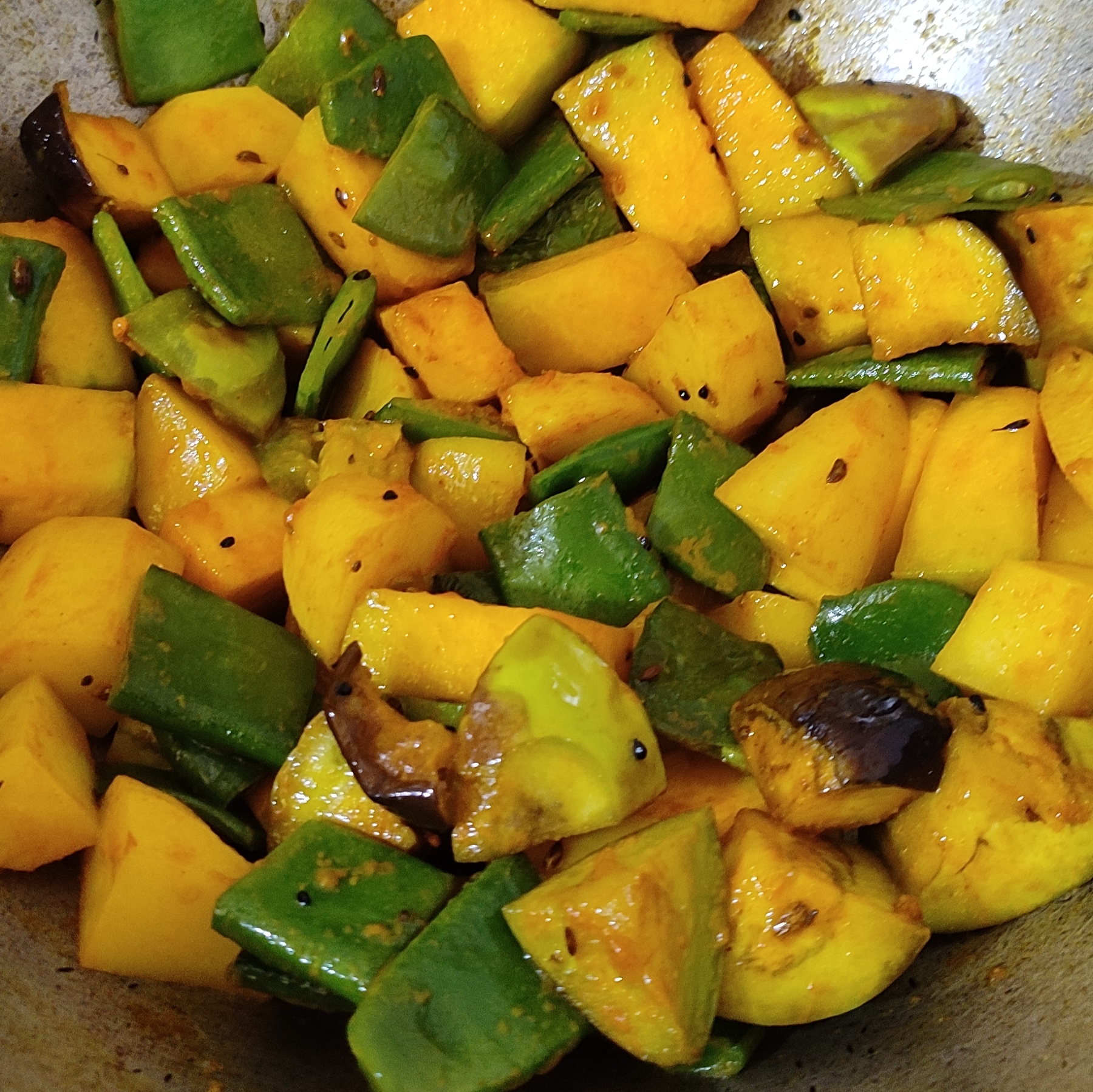 ৭)এরপর পরিমাণ মত নুন, হলুদ ,মিষ্টি দিয়ে সবজি গুলো নেড়ে চেড়ে ৫মিনিট ভালো করে কষাতে হবে।