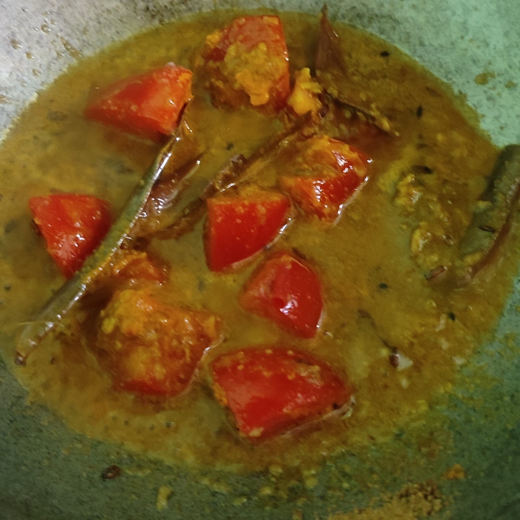 8)এবার তার মধ্যে আদাবাটা, কাঁচালঙ্কাবাটা,টমেটো, জিরেরগুরো, দিয়ে কিছুক্ষন নেড়ে চেড়ে নিতে হবে।