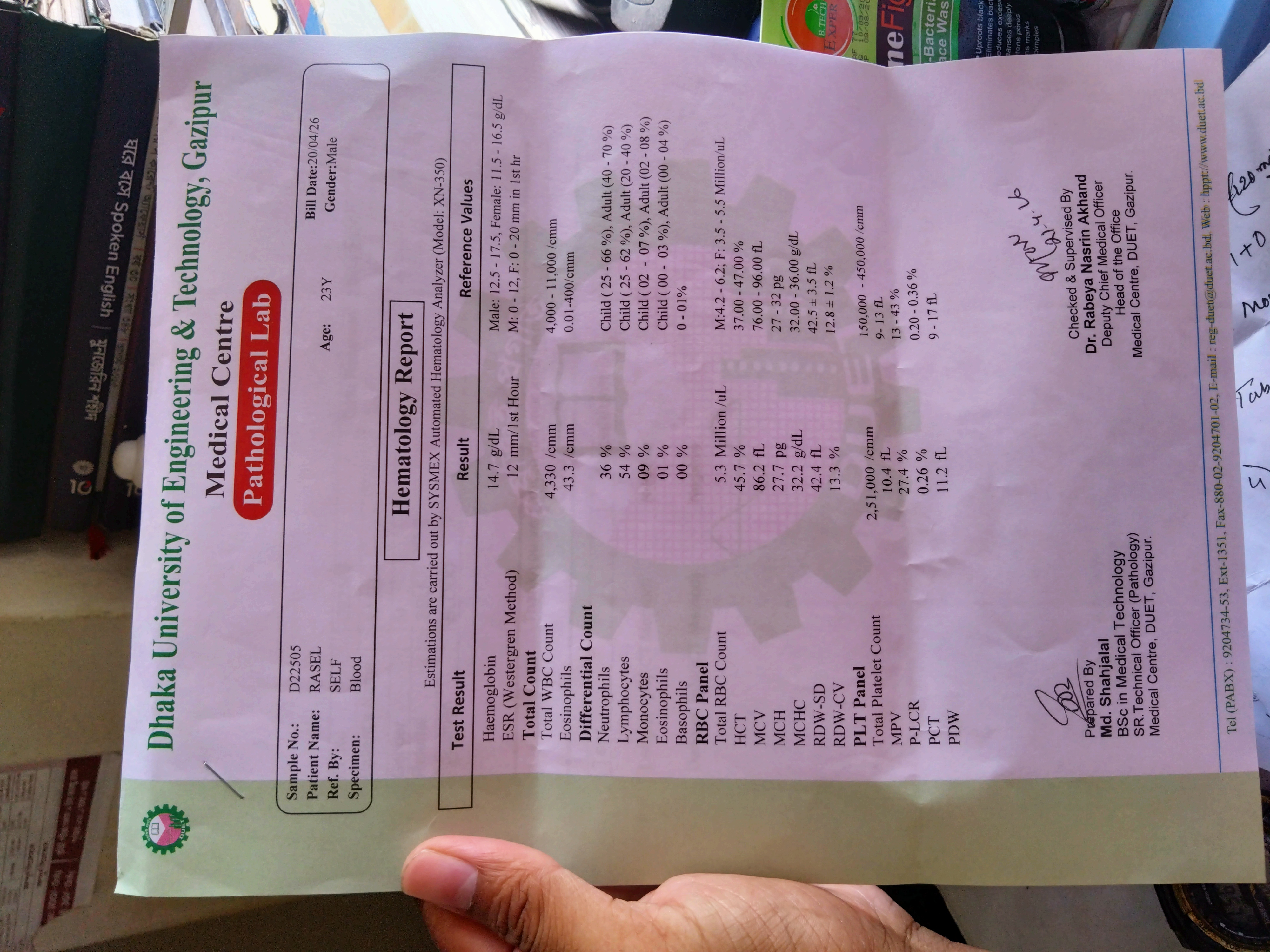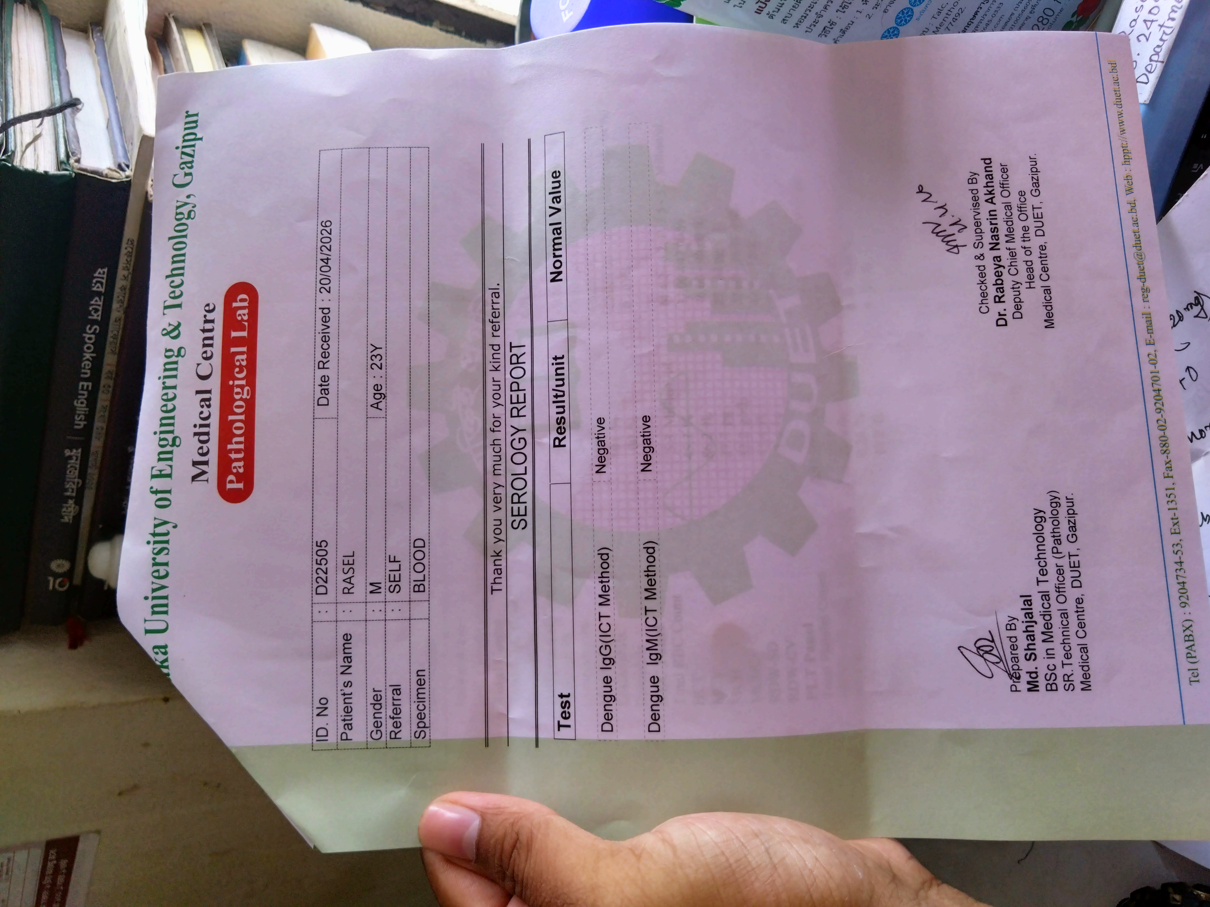 On Saturday morning, my roommate poured water on my head again. I also took medicine. After noon, the fever subsided a little. Then in the afternoon, I studied a little. I did some math, and then I quickly went to sleep at night. Everything about Sunday's exam is to rely on Almighty Allah. Because, I did not study much with a sick body. I went to take the exam on Sunday with a sick body. After finishing the exam, I went to Duet Medical and saw the doctor first. The doctor gave me some medicine and let me get tested for dengue. Because I had seen the doctor twice before because of such fever. So he asked me to get tested this time. I also let me get tested without hesitation. The next day I showed the report to the doctor. Alhamdulillah, dengue was negative. But my body was not getting better. The doctor said to eat properly and take medicine.
