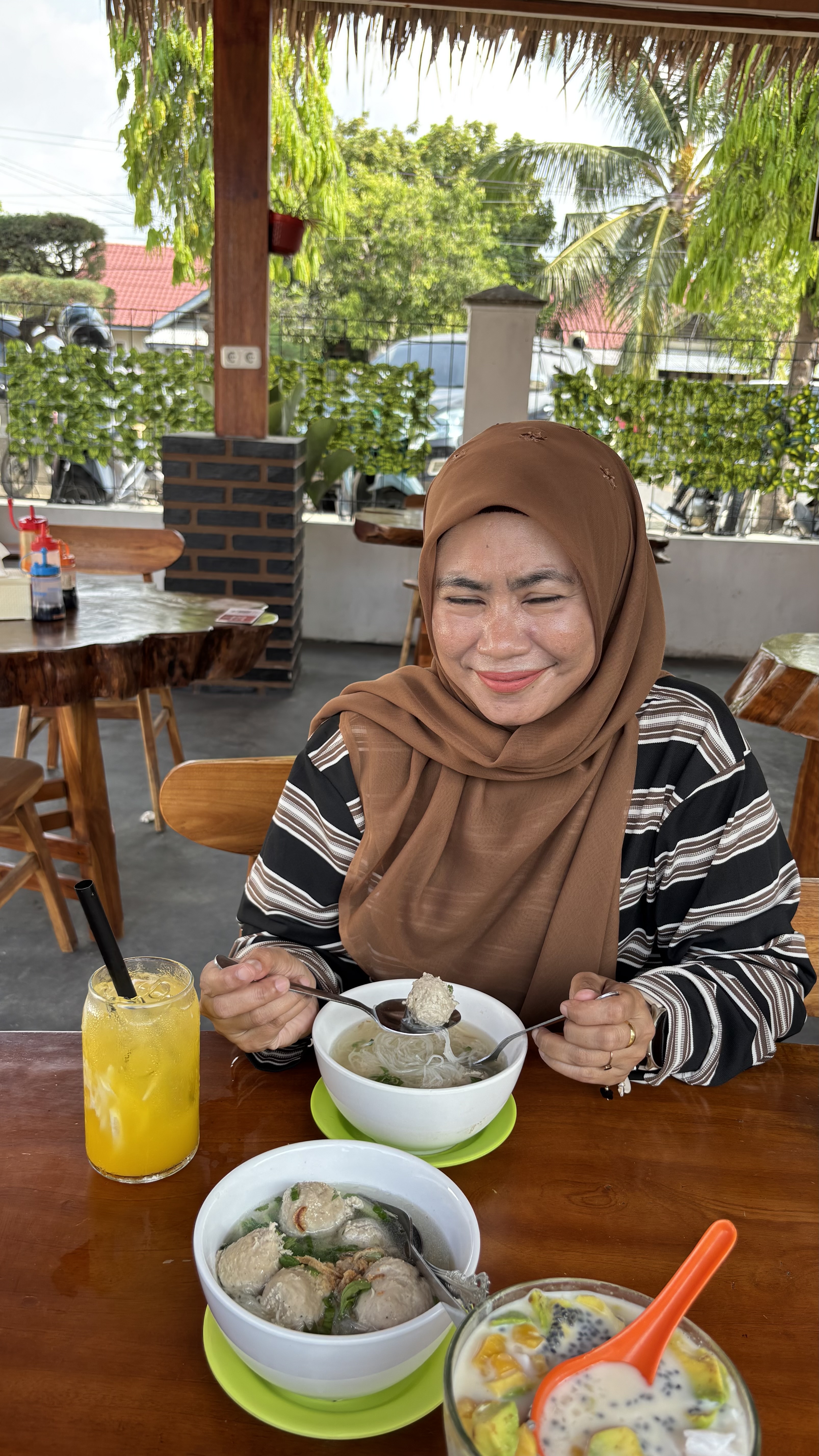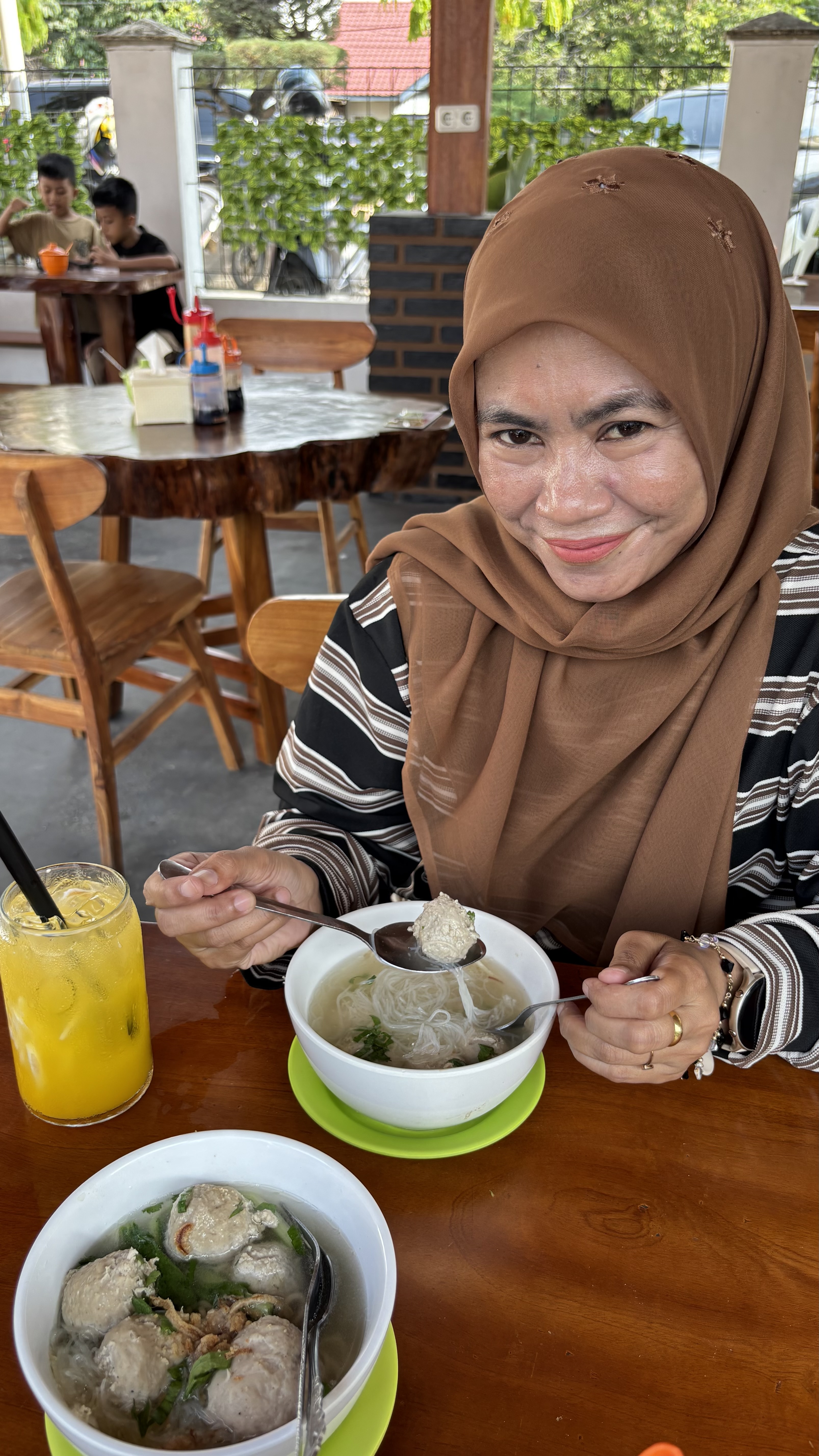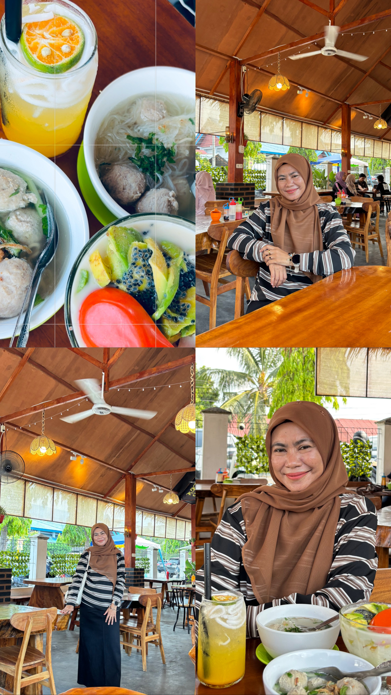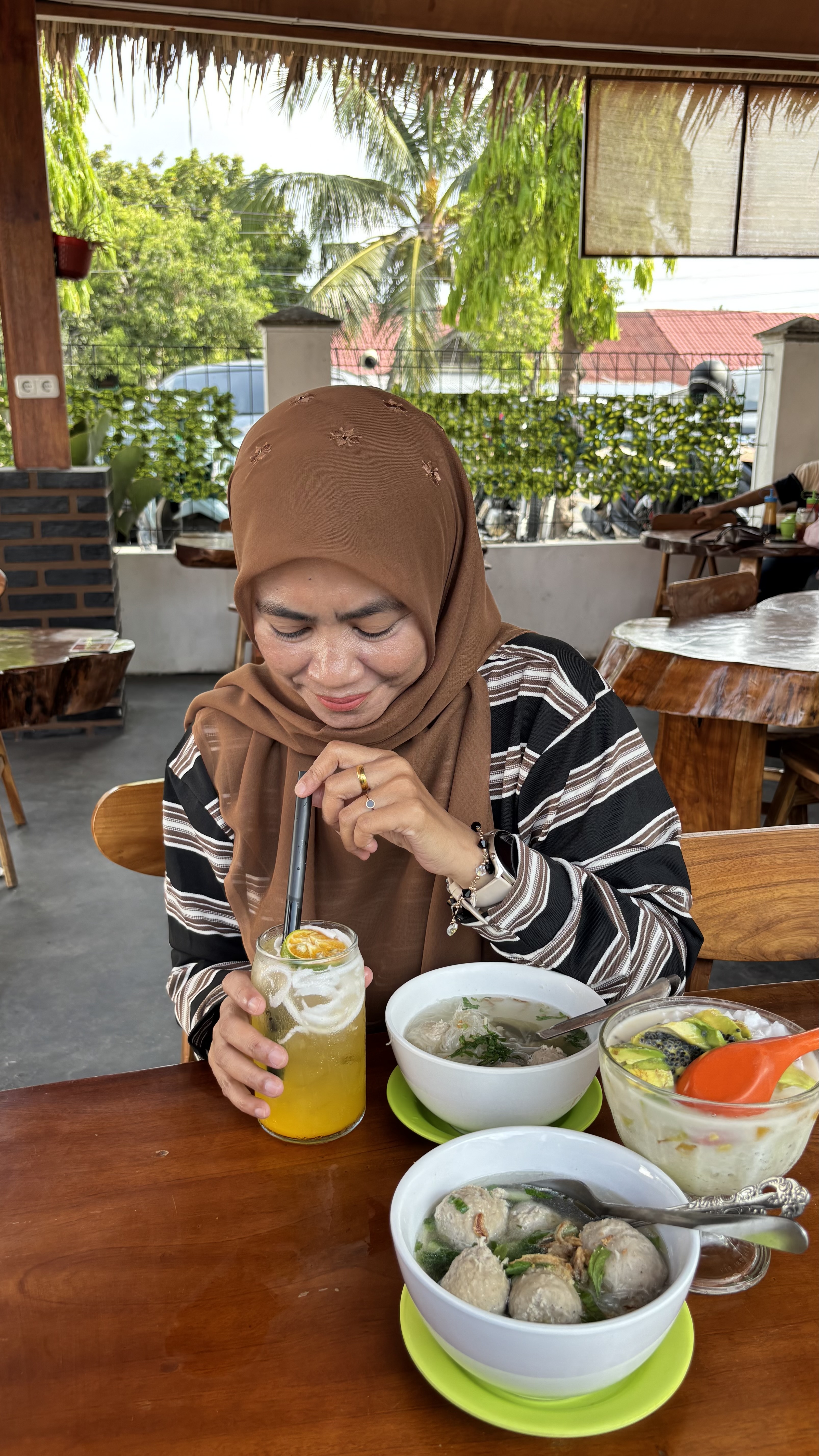 Ba'da shalat dzuhur aku berdandan dan bersiap. Siang ini meskipun cuaca lumayan terik aku bersemangat untuk jalan-jalan dan nongky. Bersama si sulung kami menuju ke pusat kota, ia mengajak ku ke salah satu warung bakso yang baru saja buka dan terkenal dengan minuman es telernya.