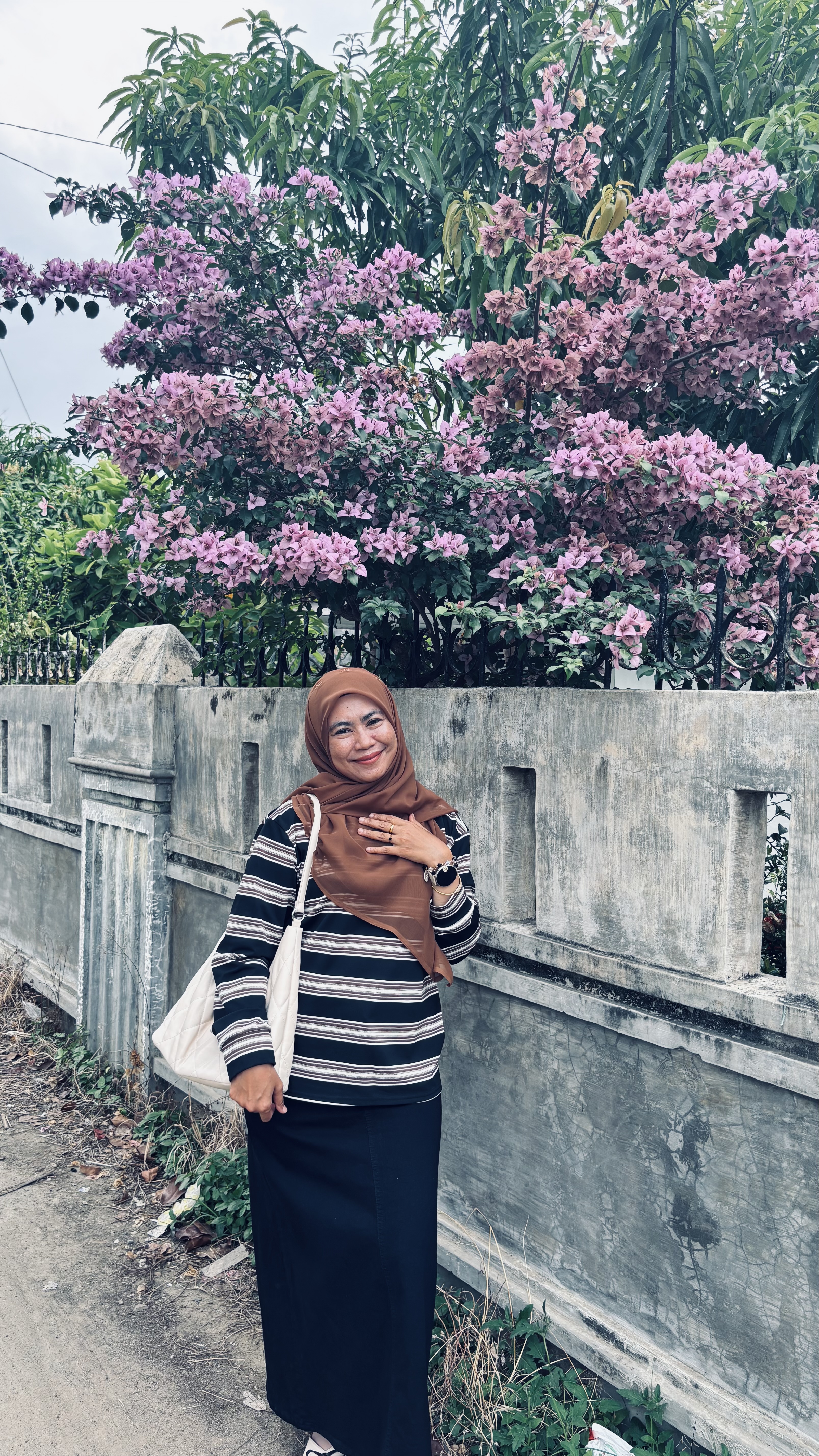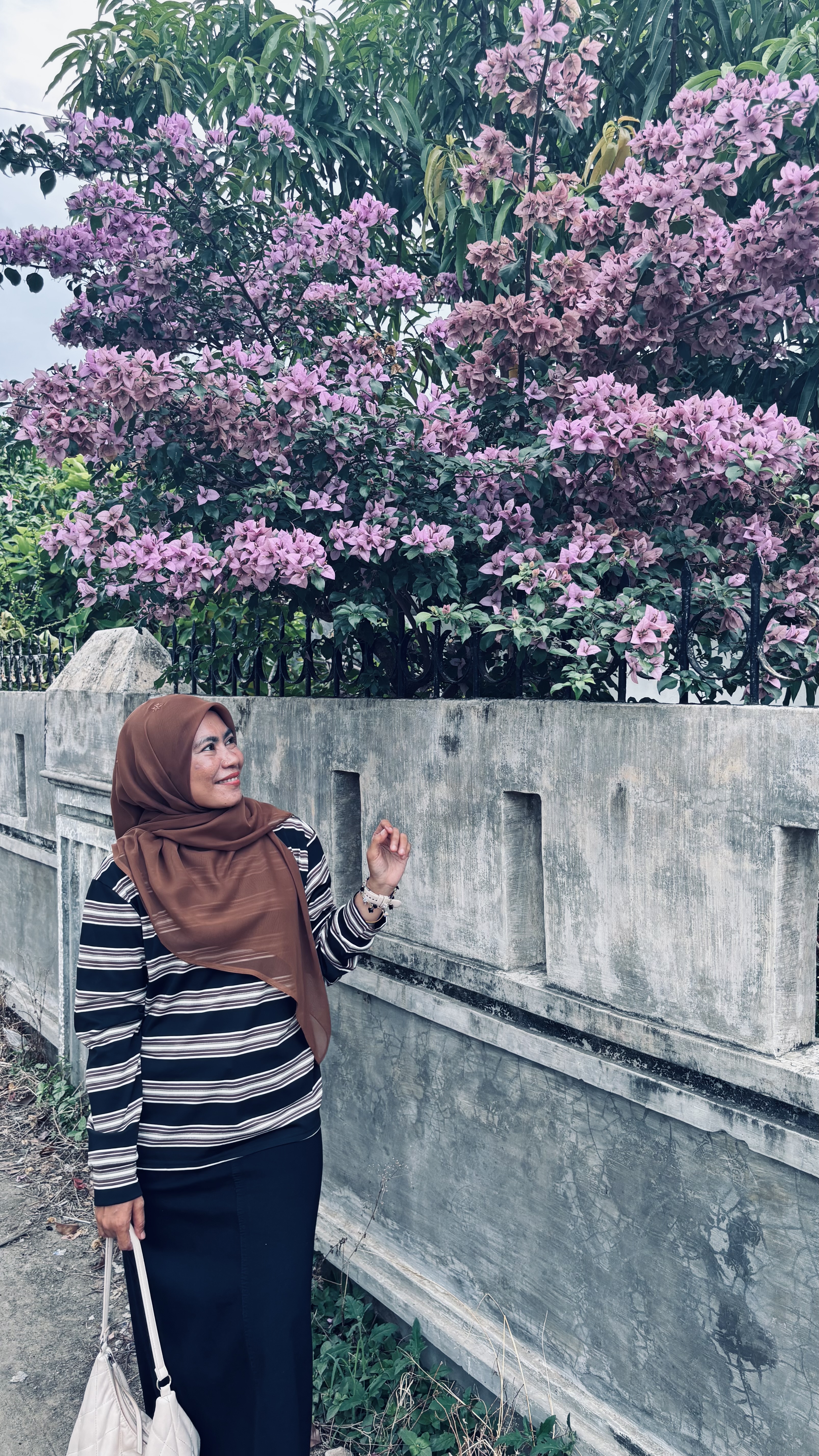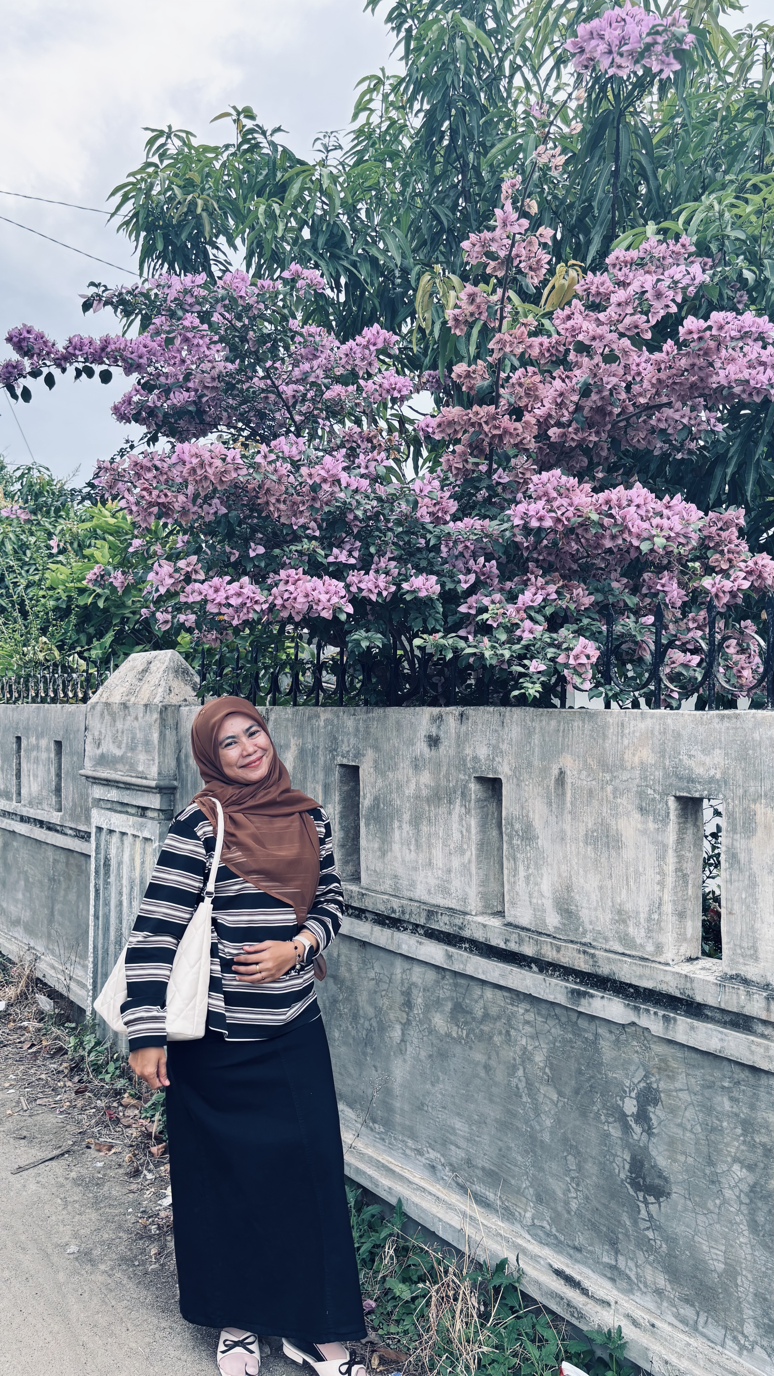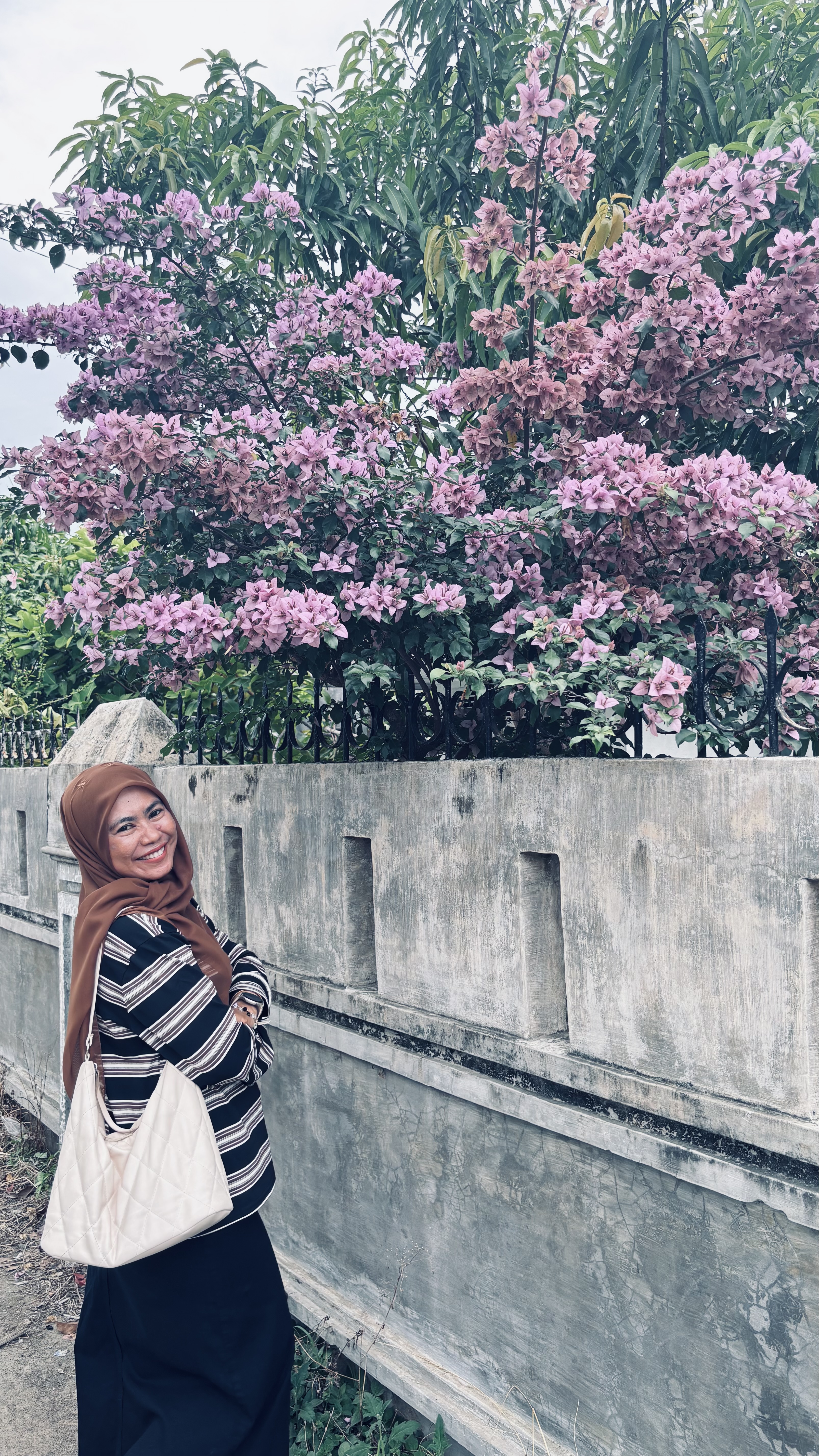 Di perjalanan pulang kami melihat tanaman bunga bougenville yang bunganya sedang bermekaran dengan warna ungu yang indah. Kami lantas mampir dan melakukan sesi foto di spot pinggir jalan dengan background tanaman bunga tersebut. Kemudian kamipun tertawa bahagia