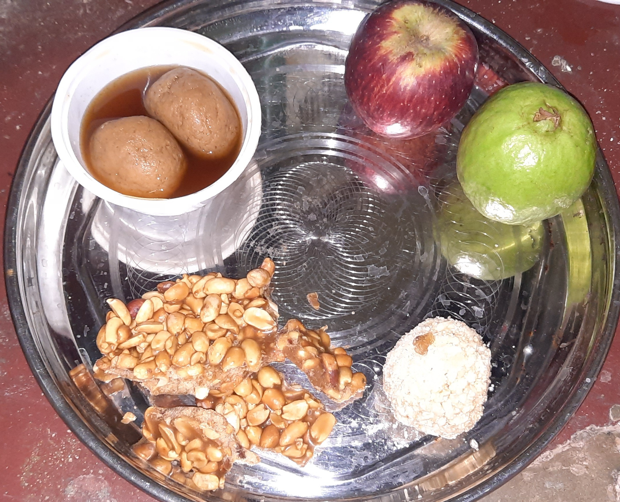 ঘটের মধ্যে সামান্য জল দিয়ে তার মধ্যে ধান,হলুদ,মান ও কচু,মটর,সরষে,শুষনী,কলমী,পাঁচটা ছোটো বটের ডাল দিয়ে দিলাম।তারপরে একটা থালায় নতুন গুড়ের মোয়া,বাদাম পাটালী, নতুন গুড়ের মিষ্টি ,আপেল,পেয়ারা দিয়ে সাজিয়ে দিলাম।