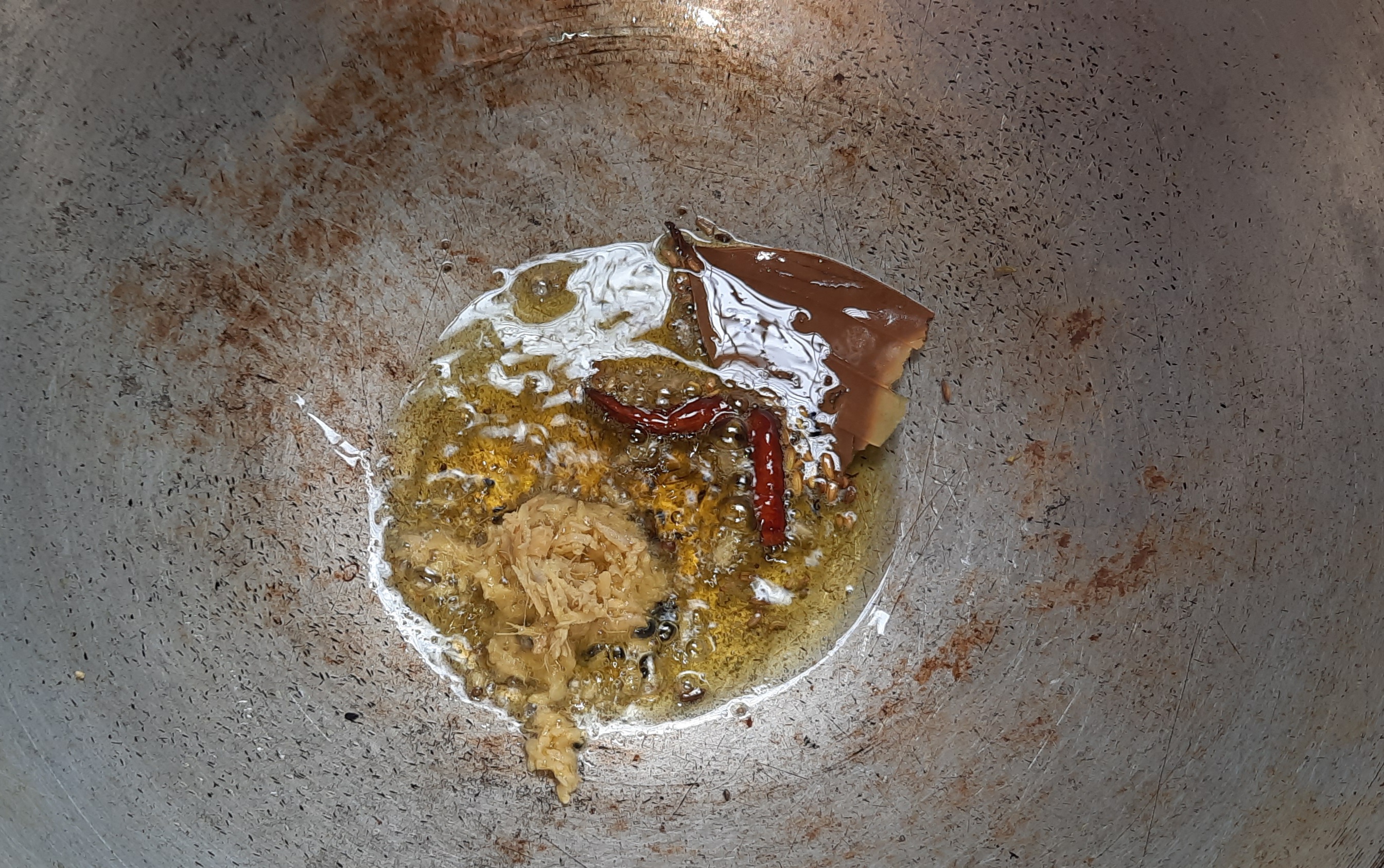 ৫)গরম তেলের মধ্যে তেজপাতা,শুকনো লঙ্কা,পাঁচফোড়ন, আদাবাটা দিয়ে ভালো করে মিশ্রিয়ে নিলাম।