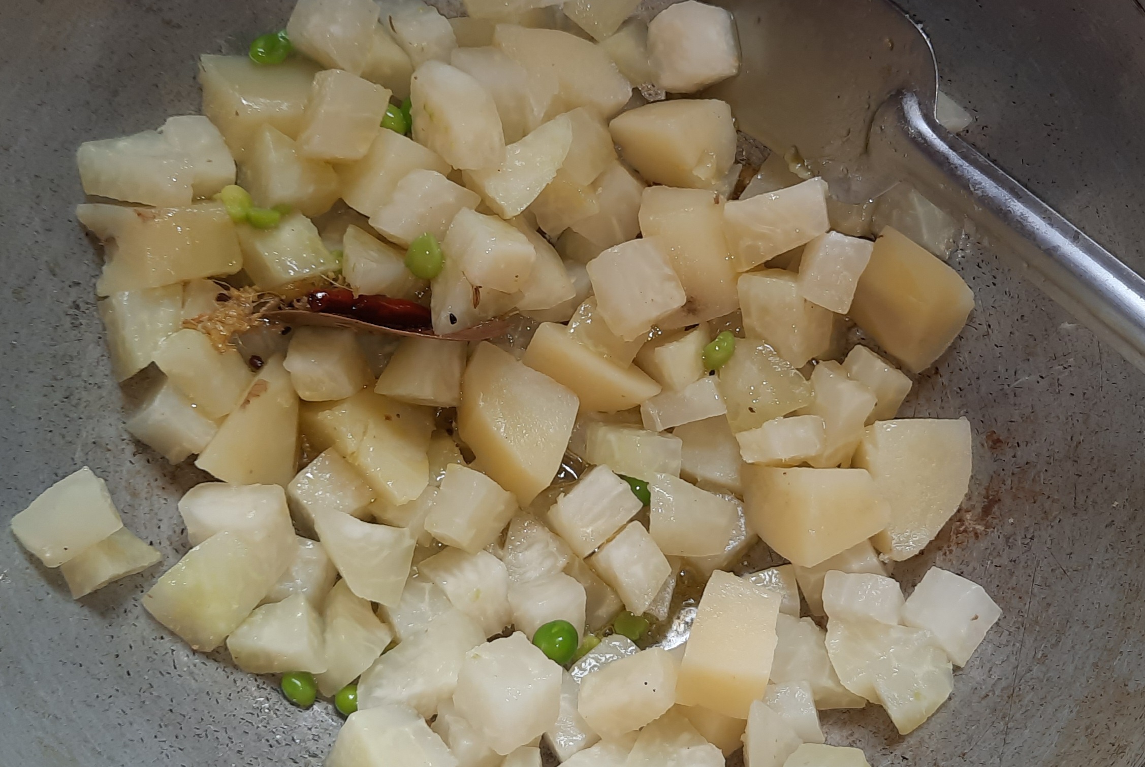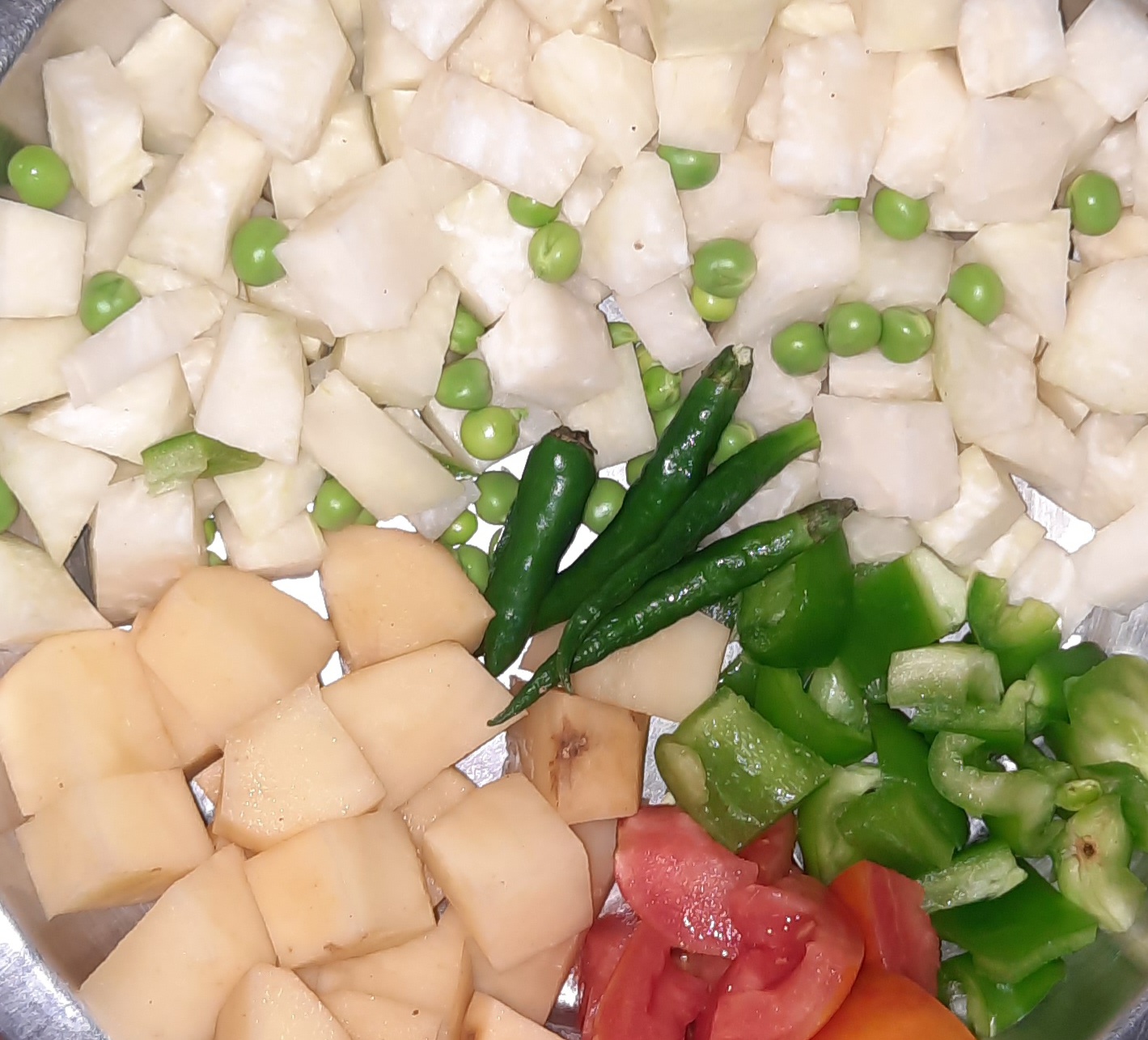 ৬)তারপরে সেদ্ধ করা ওলকপি,আর কড়াইশুটি গুলো ওর মধ্যে ঢেলে দিলাম।