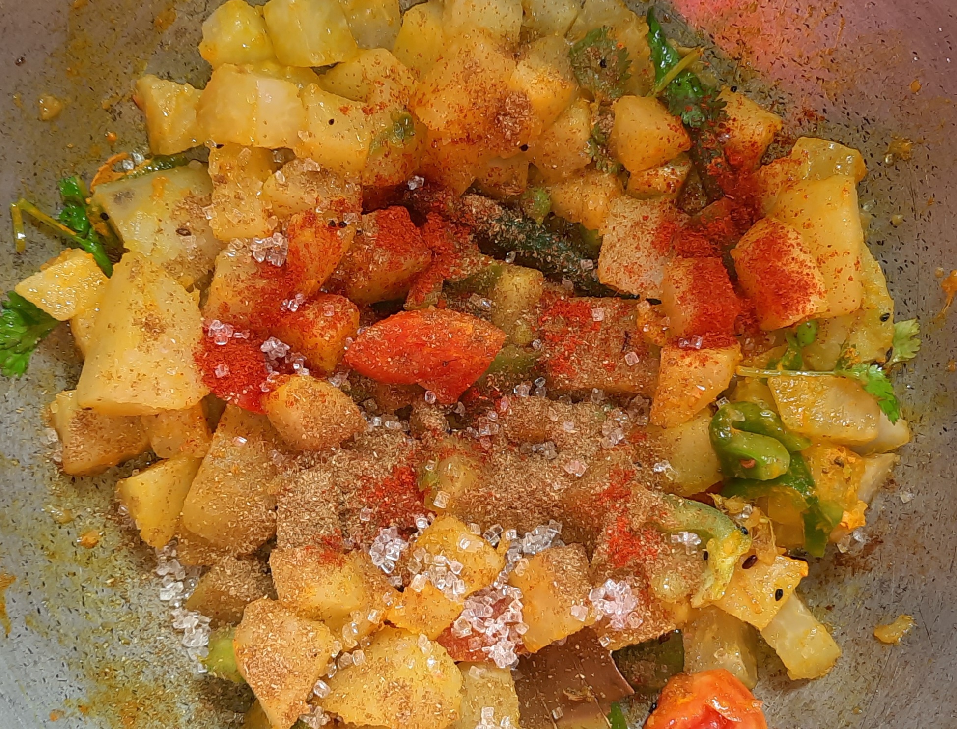 ৮)তারপরে সবজি গুলোর মধ্যে জিরের গুঁড়ো, ধনের গুঁড়ো,লঙ্কার গুঁড়ো, চিনি,নুন দিয়ে ভালো করে মিশ্রিয়ে নিলাম।