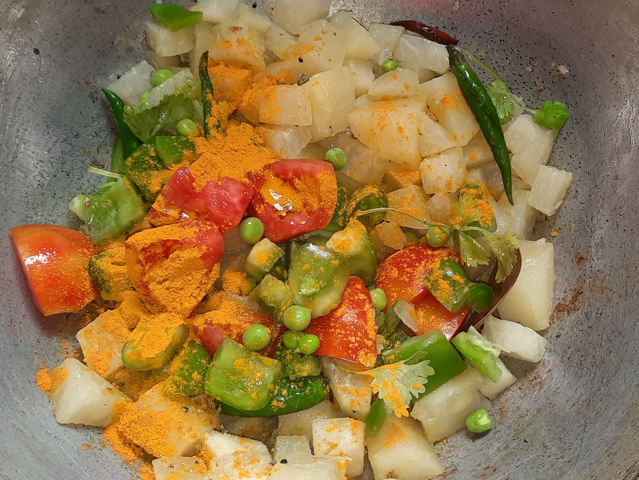 ৭)তারপরে টমেটো, ক্যাপসিকাম, কাঁচা লঙ্কা, নুন,হলুদ দিয়ে ভালো করে মিশ্রিয়ে নিলাম।