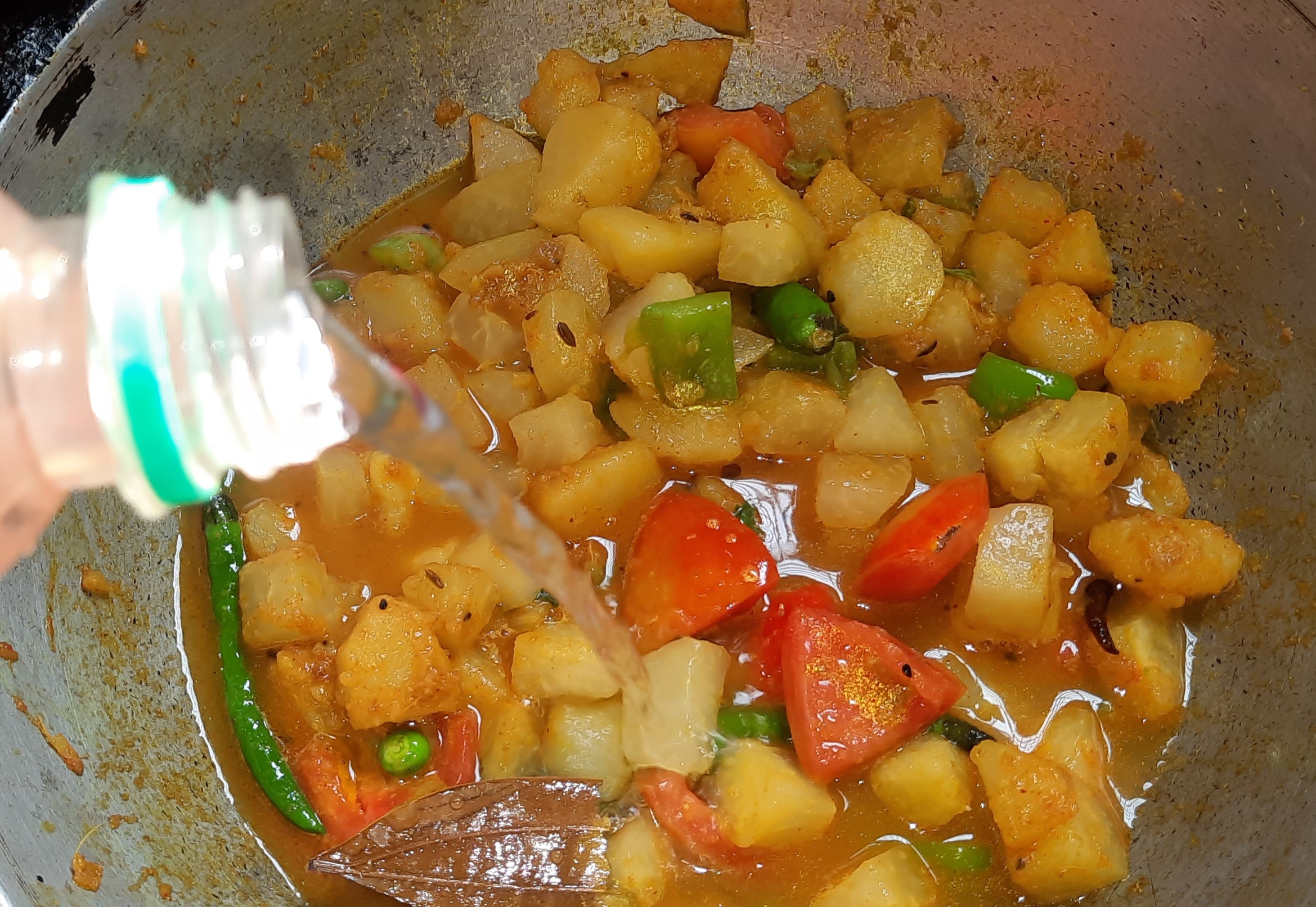 ৯)মশলাটা ভালো করে কষানোর পরে ১ কাপ জল দিয়ে দিলাম।