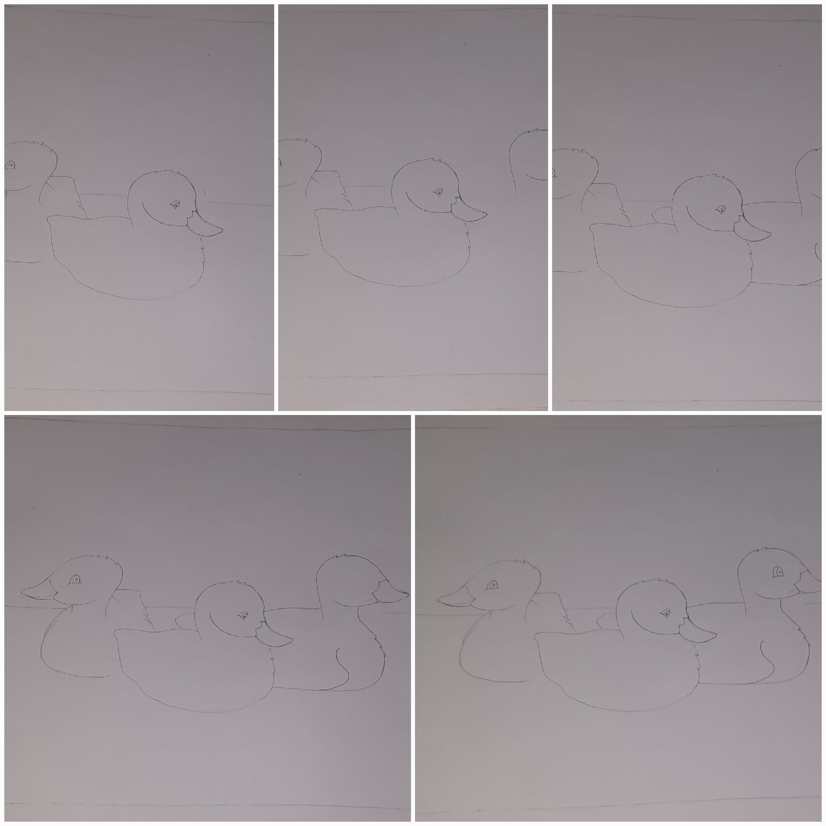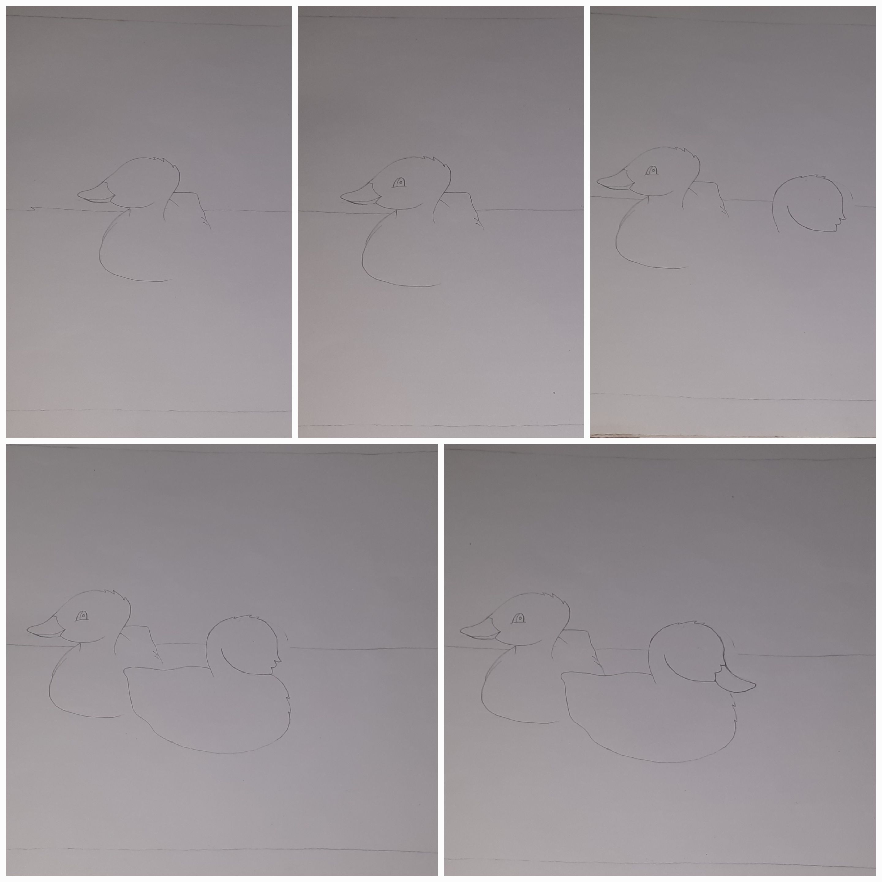 ১২)তারপরে দ্বিতীয় হাঁসটা থেকে একটু দূরে সোজা দাগটা মুছে একটা গোল করে একটা ছোটো দাগ টানলাম।