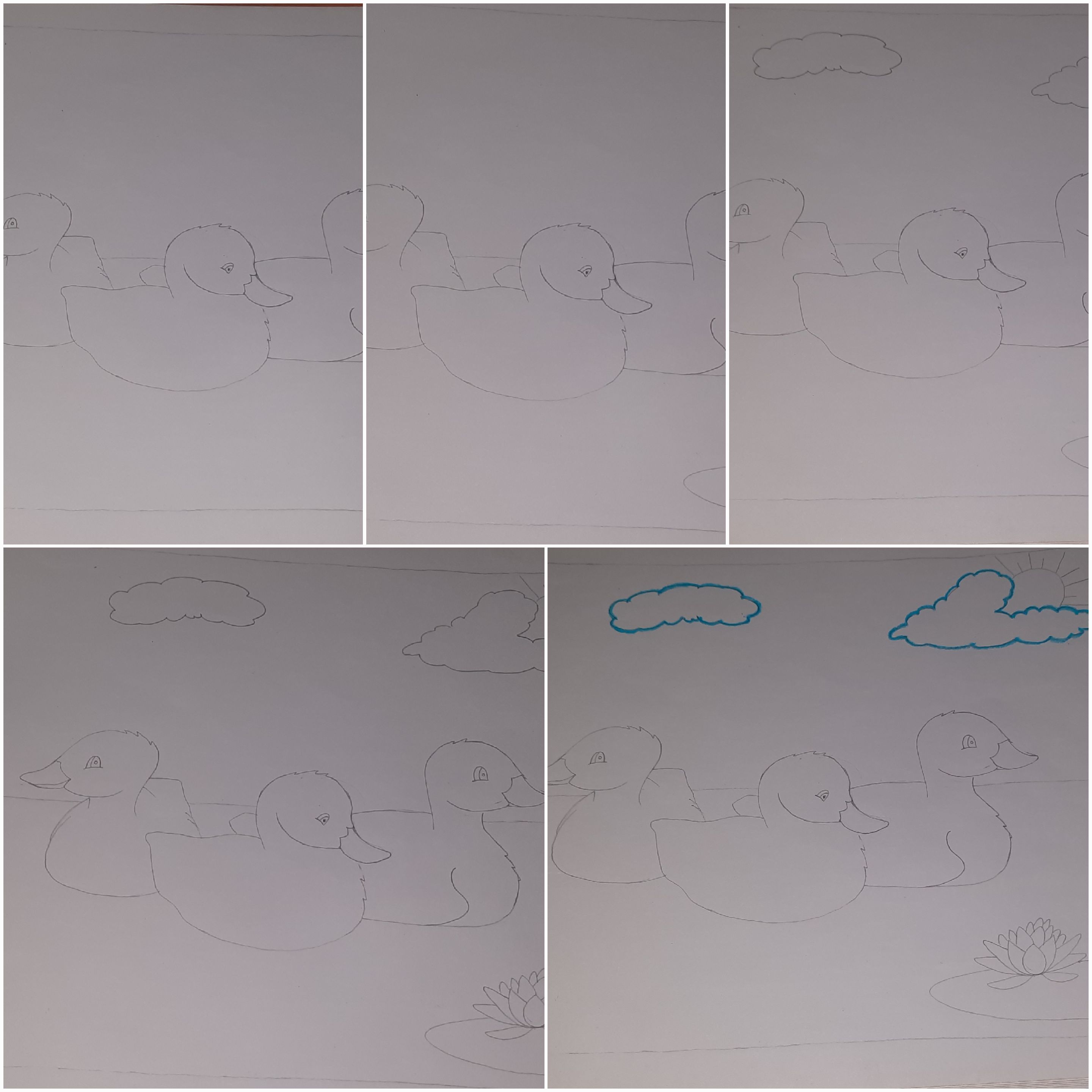 ১৮)তারপরে হাঁস গুলোর একদম মাথার ওপরে ছোটো ইউ করে দুটো মেঘ করলাম।