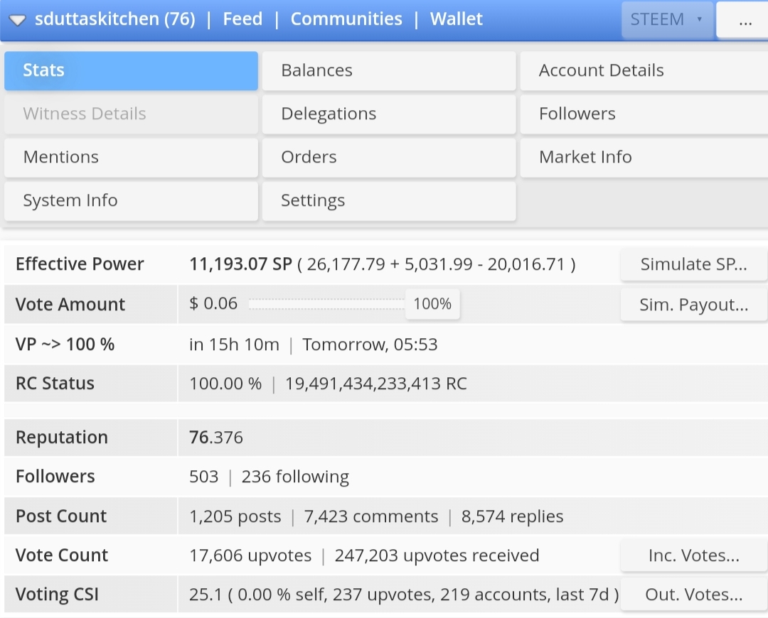 Your key stats-own SP, CSI, Reputation, Delegations. |