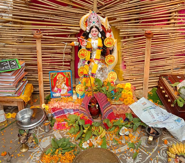 গিয়ে দেখি মা সরস্বতী ঠাকুরকে কি মিষ্টি লাগছে দেখতে, চোখ ফেরানো যাচ্ছে না। কাল যে প্যান্ডেলটি ফাঁকা ফাঁকা লাগছিল, আজ সরস্বতী মা কে তার থানে বসিয়ে প্যান্ডেলটা যেন পরিপূর্ণ হয়েছে। মা কে দেখার পর পুজোর কাজে হাত দিলাম বেল পাতা ধোয়া, ফুল সাজানো ইত্যাদি এই কাজ গুলো বাকি ছিল তাই সেরে নিলাম।