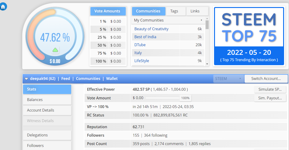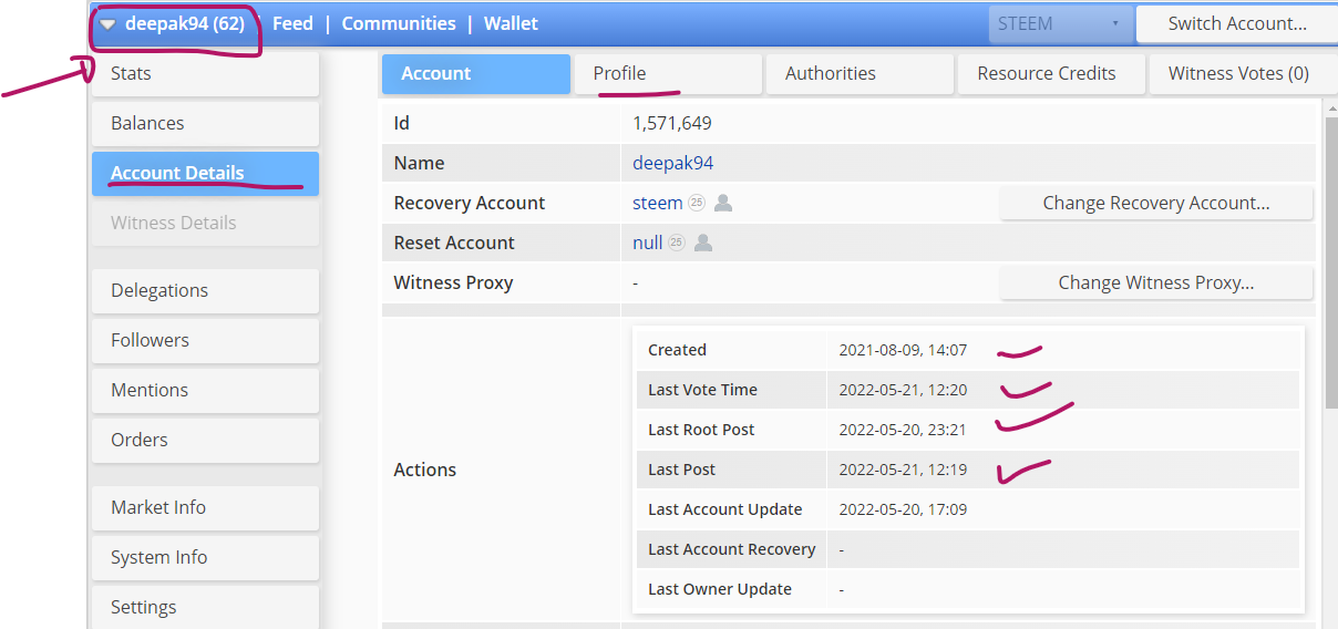 In this tab you just see your account details in a single page about all things like when your account is created, your last voting etc.
