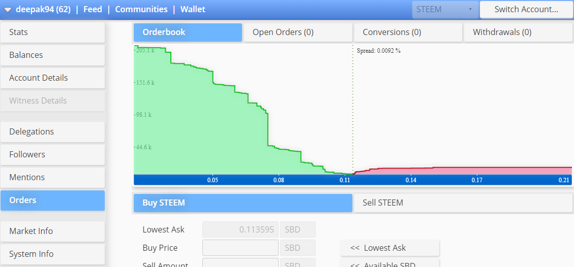In this tab user can get access the internal market of steemit where we can convert our SBD to steem vice versa. In this page user can access the order book and check his open order etc.